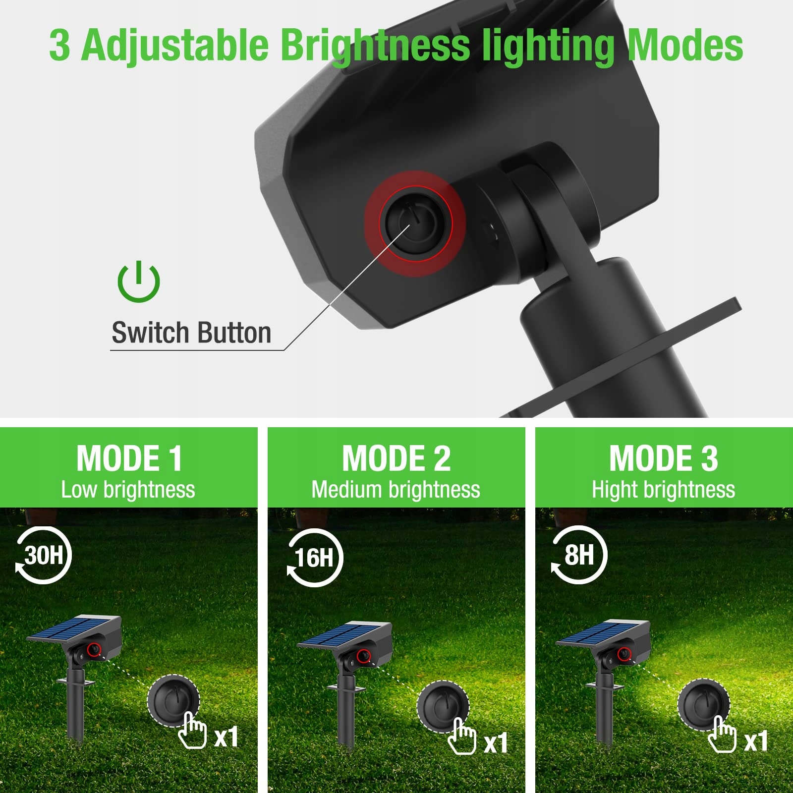 3 opcje jasności: Nasza solarny lampa ogrodowa na zewnątrz oferuje 3 tryby dostosowane do Twoich potrzeb w różnych sytuacjach. 1. Tryb niskiej jasności (30% jasności/30 godzin), tryb średniej jasności (60% jasności/16 godzin), tryb wysokiej jasności (100% jasności/8 godzin). Panel solarny ma funkcję czułości na światło. Automatycznie włącza się o zmierzchu i wyłącza o świcie, bez potrzeby ręcznego włączania lub wyłączania