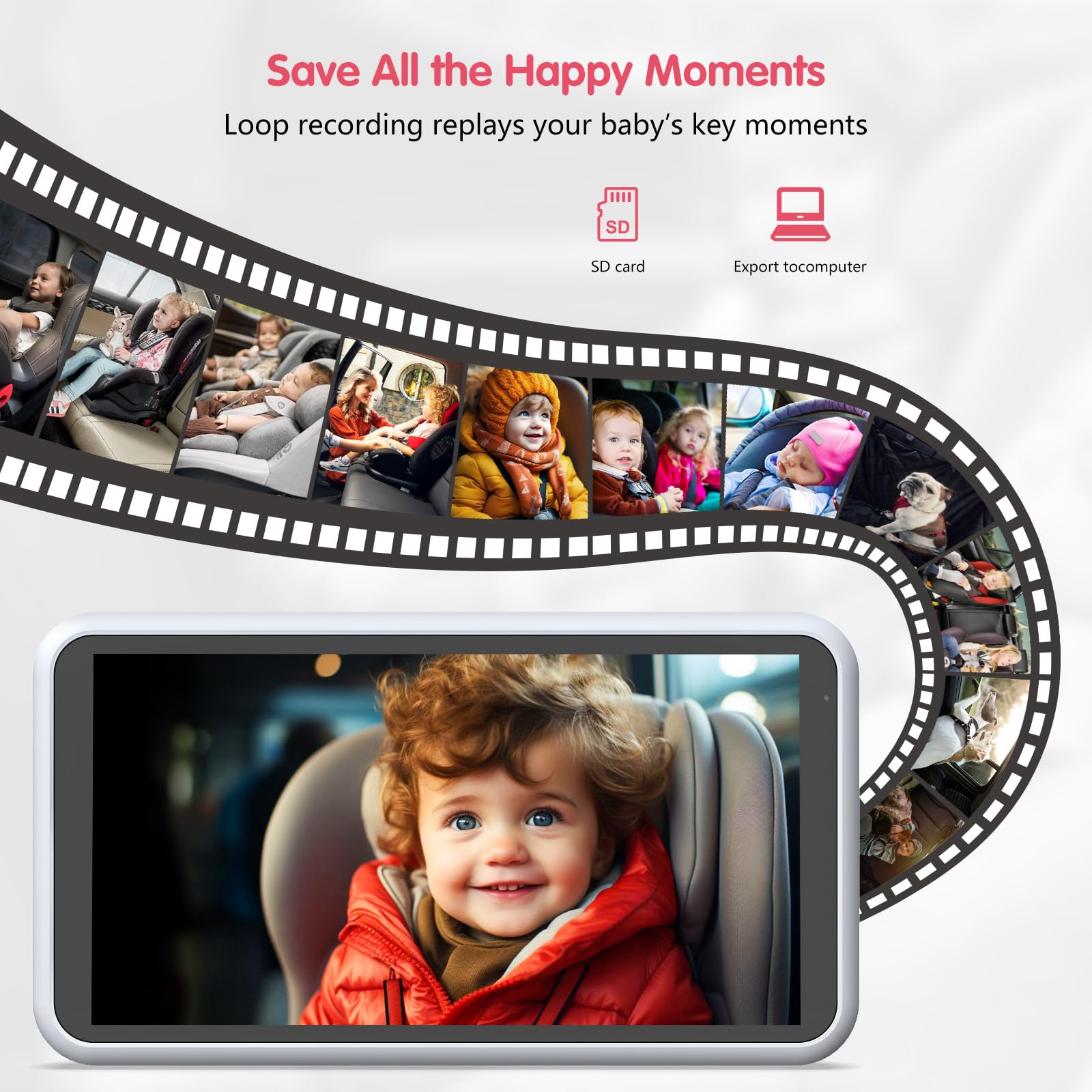 [Funkcja nagrywania wideo z kartą TF]Dzięki naszej kamerze BM3 dla dzieci w samochodzie możesz nagrywać każdą cenną chwilę swojego dziecka w samochodzie w dowolnym momencie. Nasza kamera do fotelika samochodowego jest wyposażona w kartę TF 16GB, co umożliwia łatwe przechowywanie i odtwarzanie wideo.