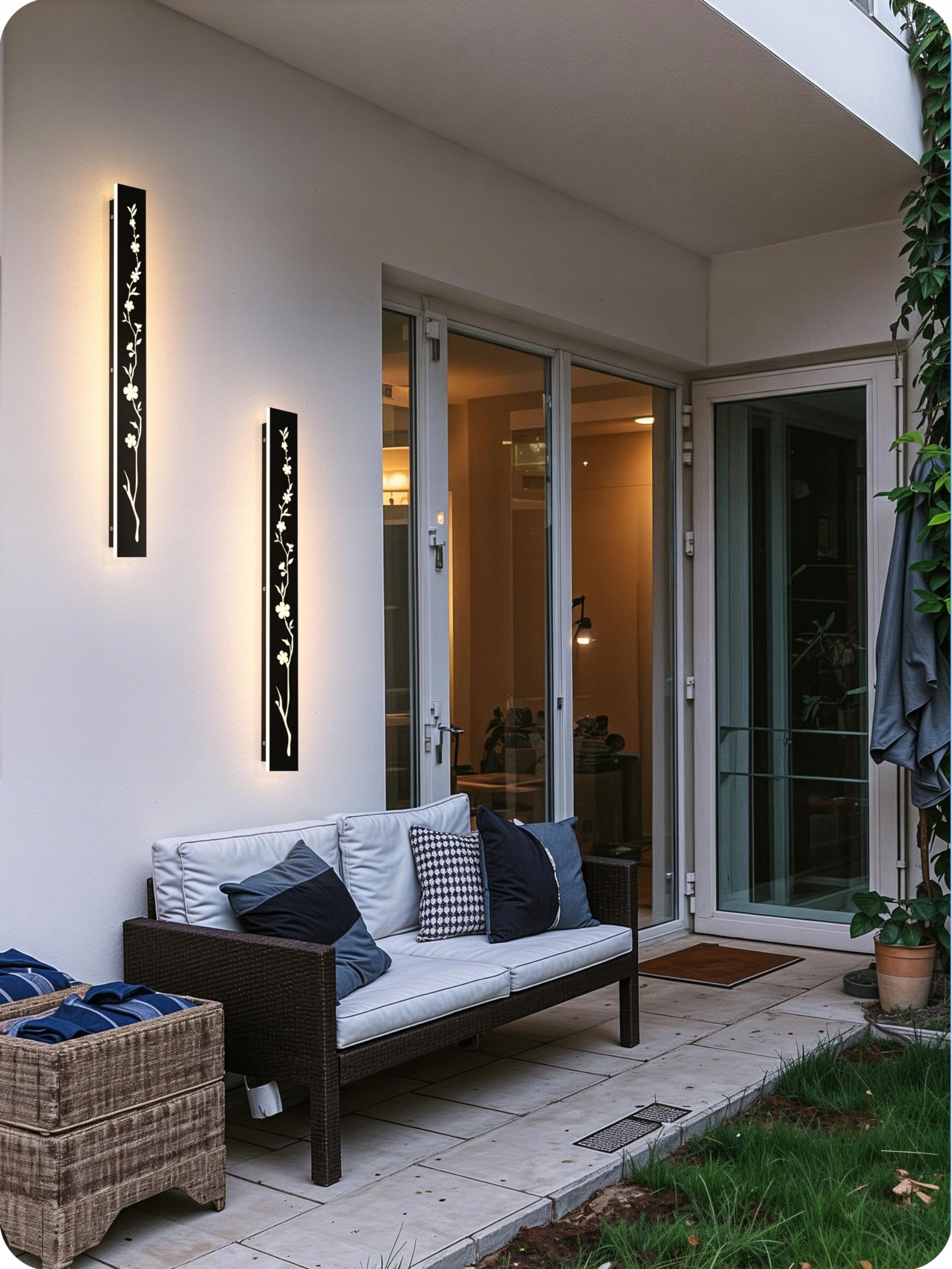 Scenariusz użytkowania: Ażurowy projekt długiej lampy zewnętrznej łączy sztukę z funkcjonalnością. Może być używana nie tylko na ścianach zewnętrznych, willach, dziedzińcach, ogrodach, tarasach, garażach, korytarzach i elewacjach sklepów, ale także w sypialniach, salonach i na schodach. Jej wykwintny design sprawia, że jest ona atrakcją w miejscu użytkowania i tworzy artystyczną atmosferę.