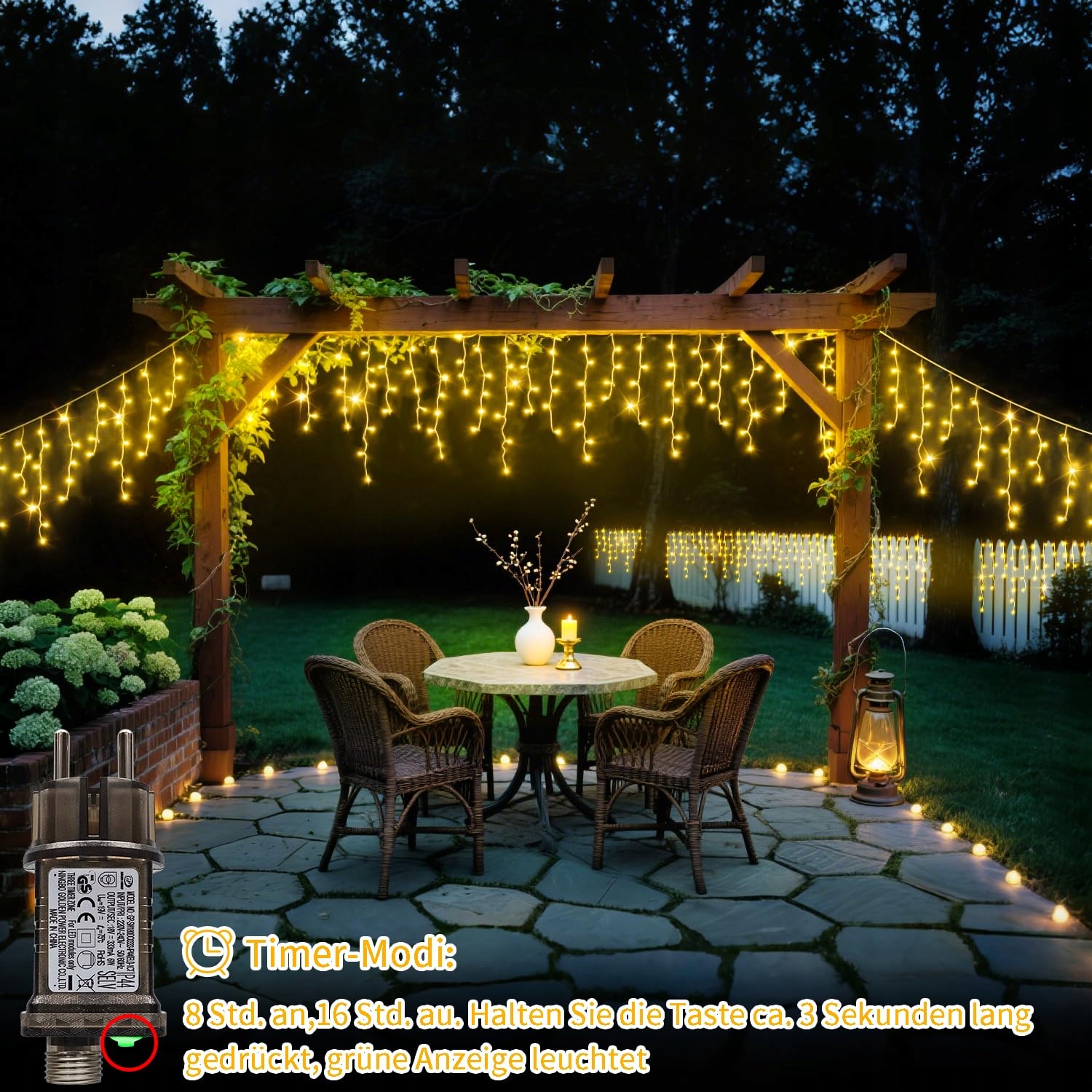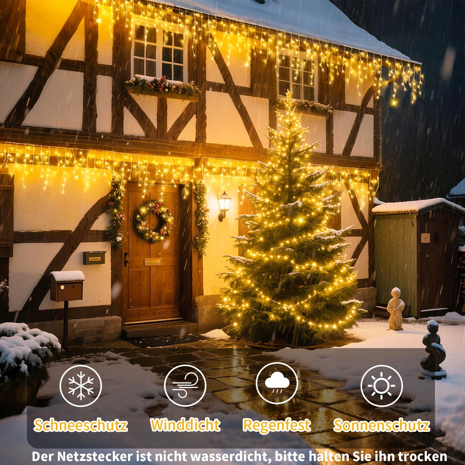 Wodoodporny: Wtykany łańcuch świetlny jest bezpieczny w dotyku, posiada klasę wodoodporności IP44 i może być używany nawet podczas deszczu i śniegu (utrzymuj wtyczkę w suchym stanie)