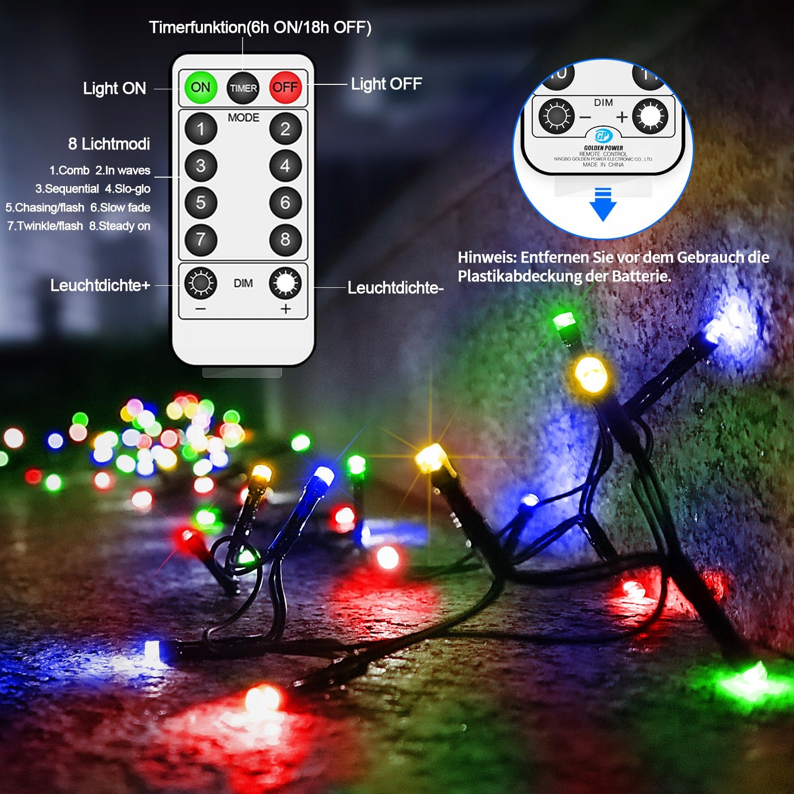 8 trybów i funkcja timera: Łańcuch LED 8 trybów, w tym kombinacja, fale, sekwencyjnie, Slo Glo, śledzenie, powolne zanikanie, miganie, światło stałe, aby dostosować nastrój. Wbudowany timer, łańcuch świetlny z pilotem automatycznie włącza się na 6 godzin i wyłącza na 18 godzin