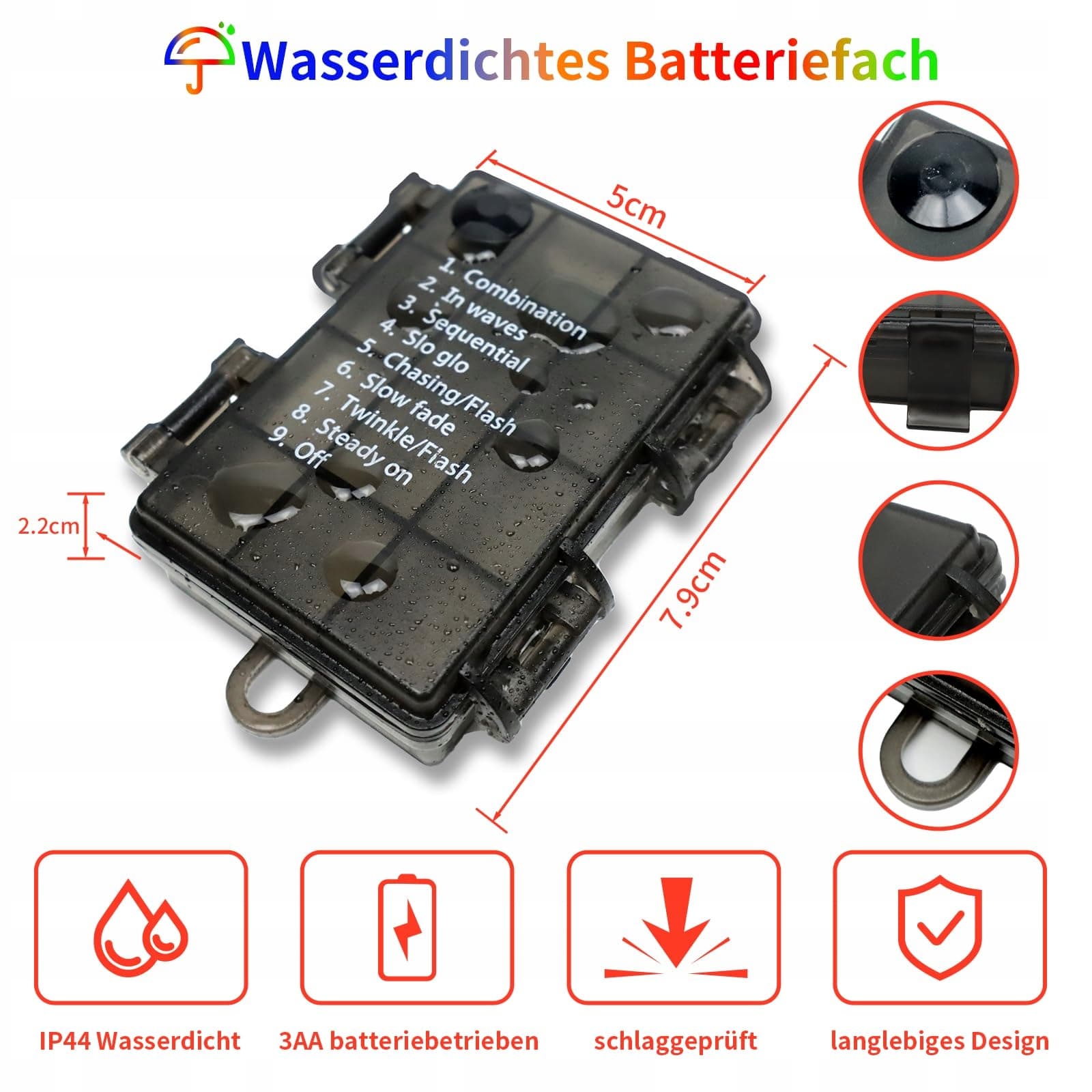 Wodoodporny: Łańcuch świetlny na baterie z wodoodpornym pierścieniem gumowym, może być używany w deszczu lub śniegu. Wodoodporny pierścień gumowy nie jest całkowicie wodoodporny, proszę nie zanurzać komory na baterie w wodzie i regularnie czyścić wodę w komorze na baterie, aby uniknąć rdzy