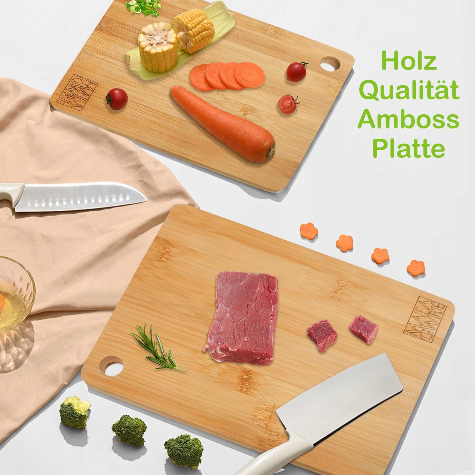 WSZECHSTRONNE MOŻLIWOŚCI ZASTOSOWANIA: Ten zestaw desek śniadaniowych z drewna został zaprojektowany tak, aby był wszechstronny. Nadaje się zarówno do krojenia mięsa i ryb, jak i do łatwego krojenia warzyw. Dzięki atrakcyjnemu designowi może być również używany jako idealna taca do serwowania na stole. Zestaw desek do krojenia spełnia zatem zarówno praktyczne, jak i estetyczne wymagania.