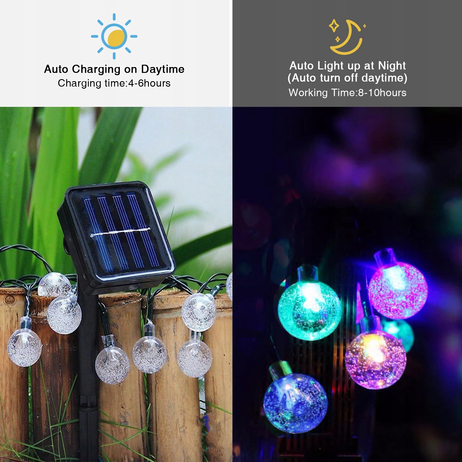 [Modernizacja paneli słonecznych w celu oszczędzania energii]Outdoor lichterkette przyjmuje zaawansowane panele słoneczne i jest wyposażona w wydajną, ładowalną baterię niklowo-wodorkową o pojemności 600mAh. Bateria może być ładowana przez 4-8 godzin i zapewnia 8-16 godzin światła nocnego. Spełnia codzienne cykle świetlne i ładowania.