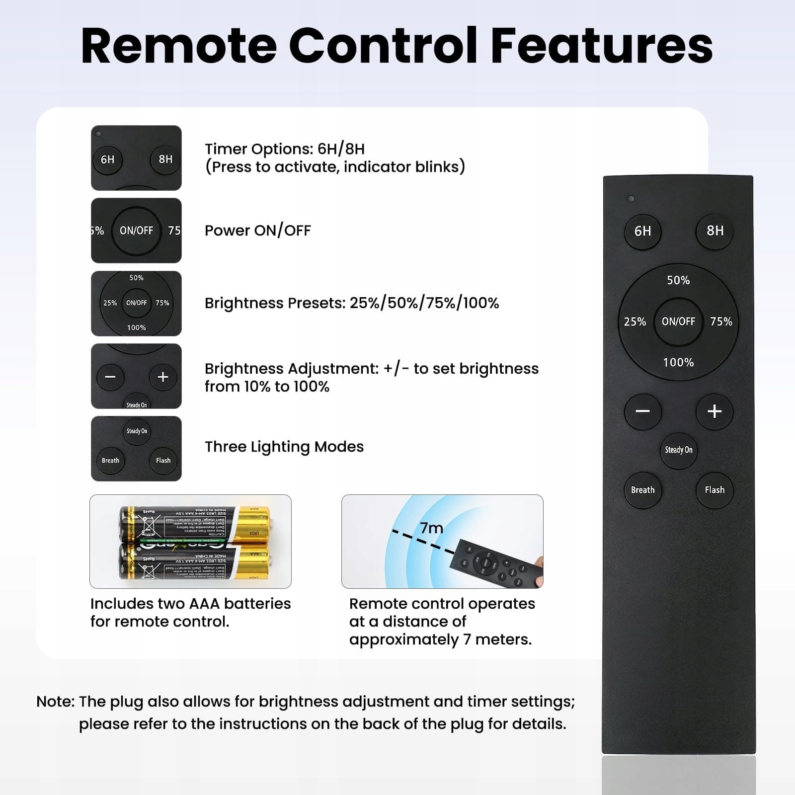 Wszechstronny pilot: Z płynną regulacją jasności od 10% do 100% oraz dwoma trybami timera możesz dostosować atmosferę oświetlenia zewnętrznego według własnych upodobań. Zasięg pilota wynosi około 7 metrów.