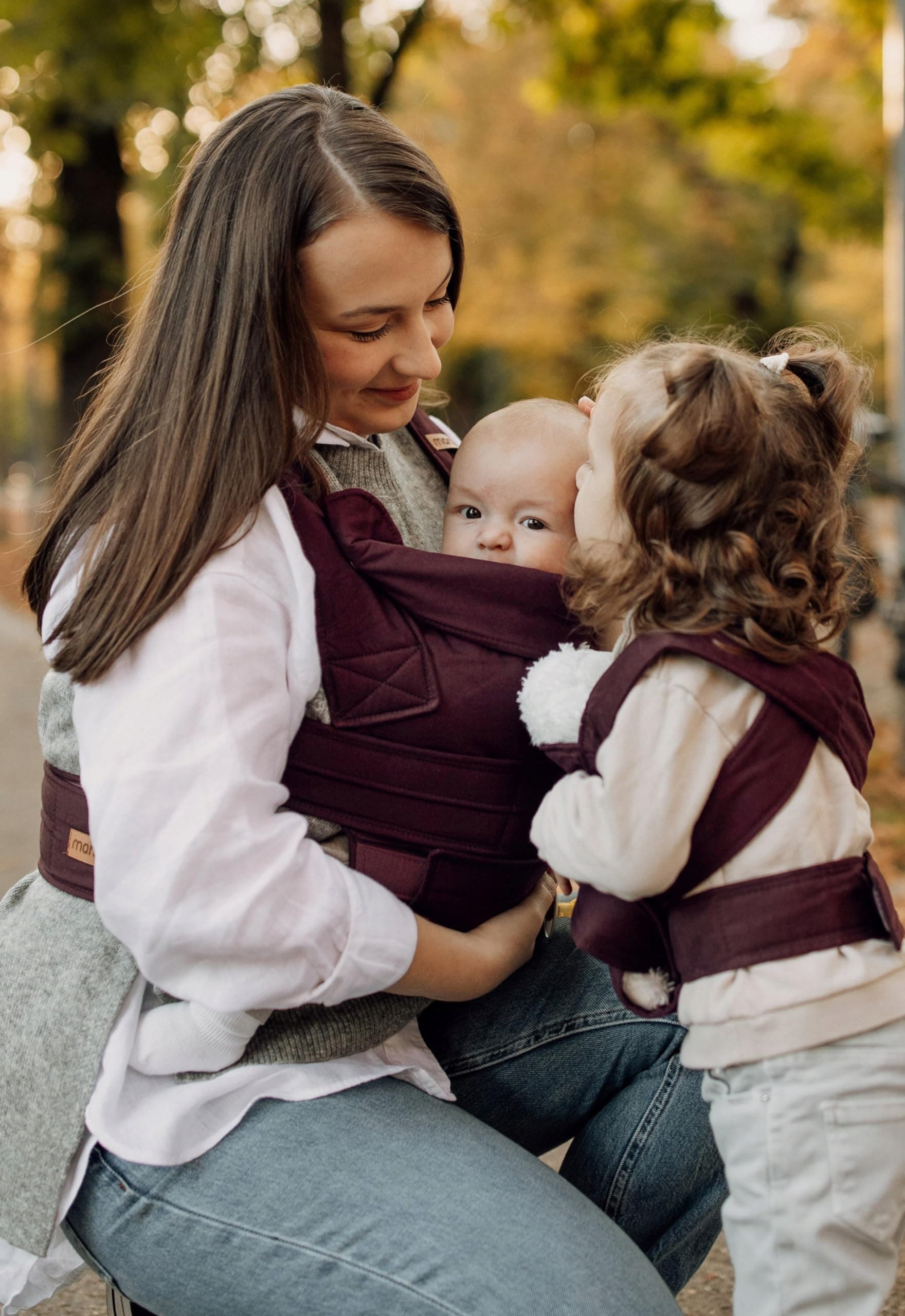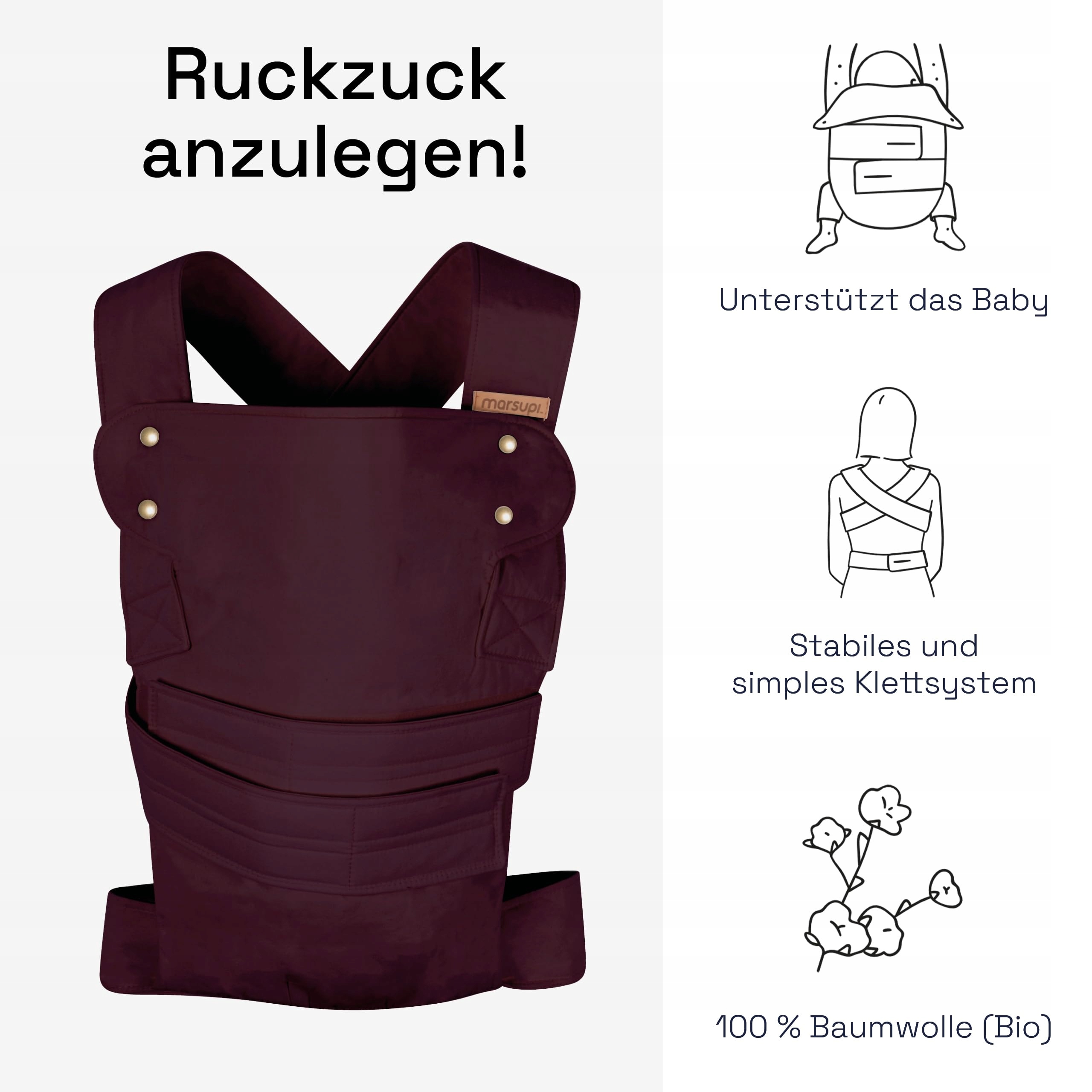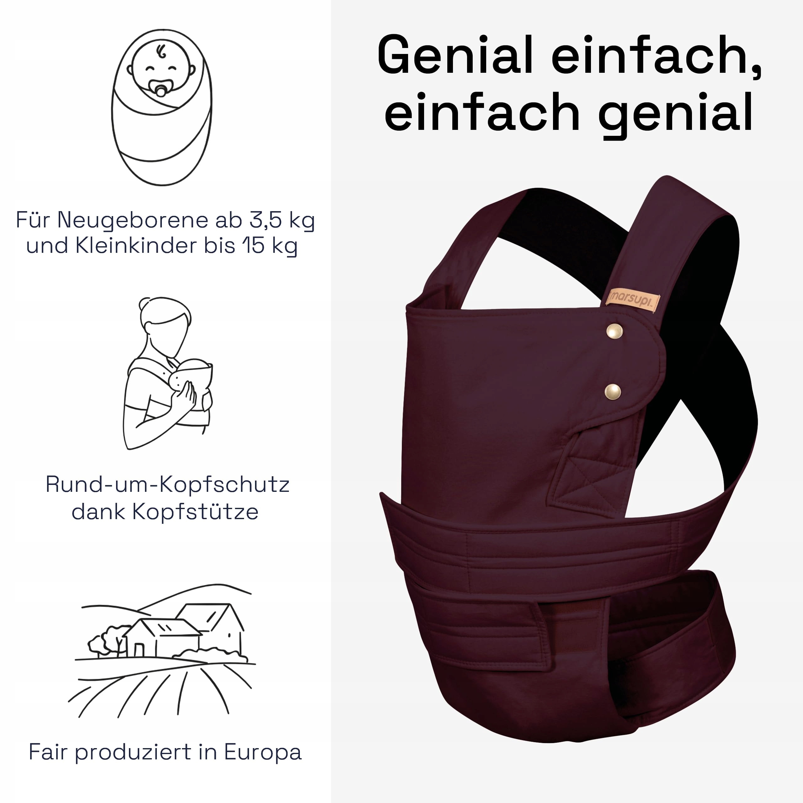 Szybkie zakładanie dzięki unikalnemu systemowi rzepów. Popularne wśród ojców (i tych, którym wiązanie chusty zajmuje zbyt dużo czasu). Z podparciem głowy (ochrona przed słońcem i wiatrem) do podniesienia. Można prać w pralce do 30°