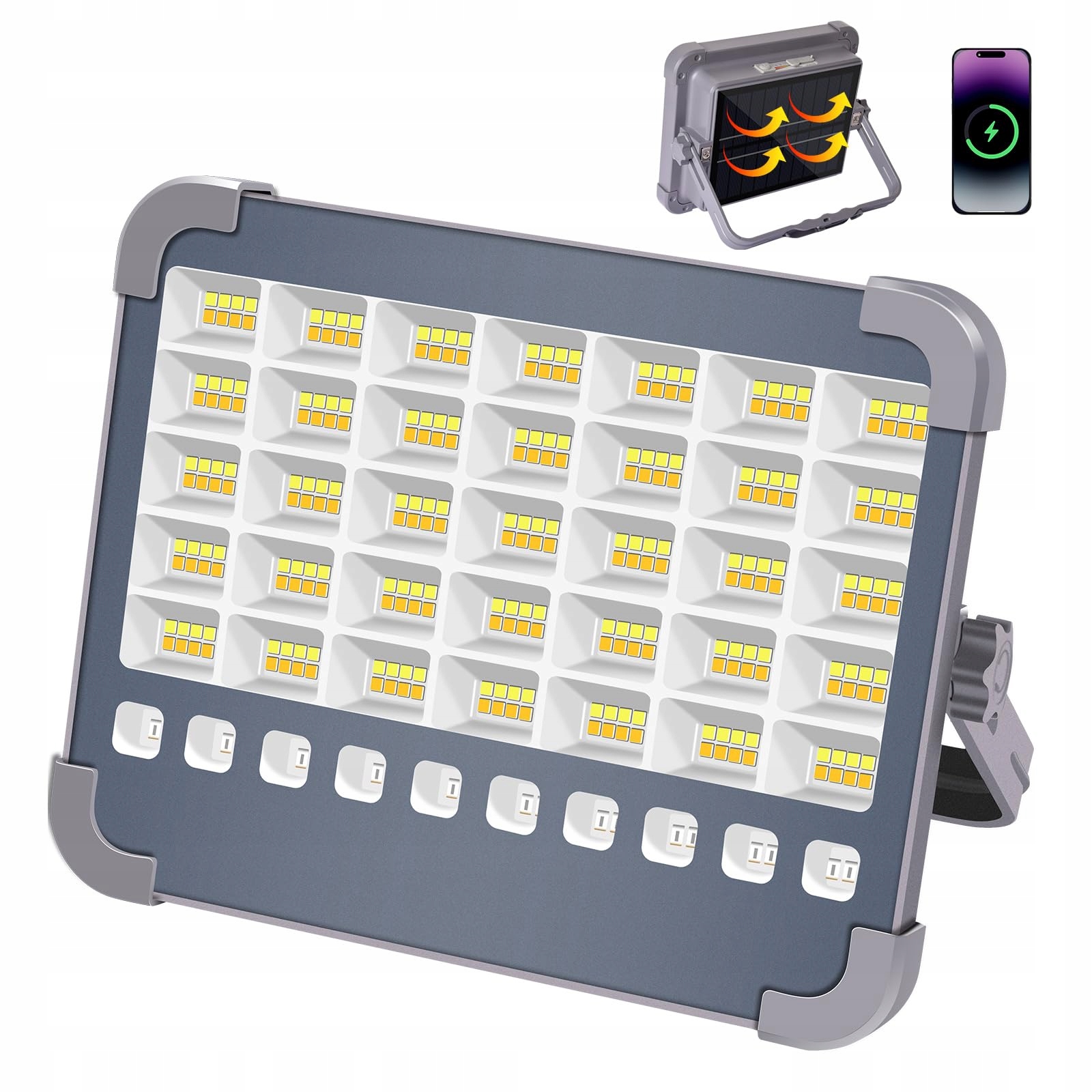 【2 METODY ŁADOWANIA】: Reflektor z akumulatorem jest wyposażony w 4 akumulatory, które można ładować za pomocą dołączonego kabla USB 5V/2A lub przez panel słoneczny, umożliwiając konwersję solar-to-elektryczność do 21%.