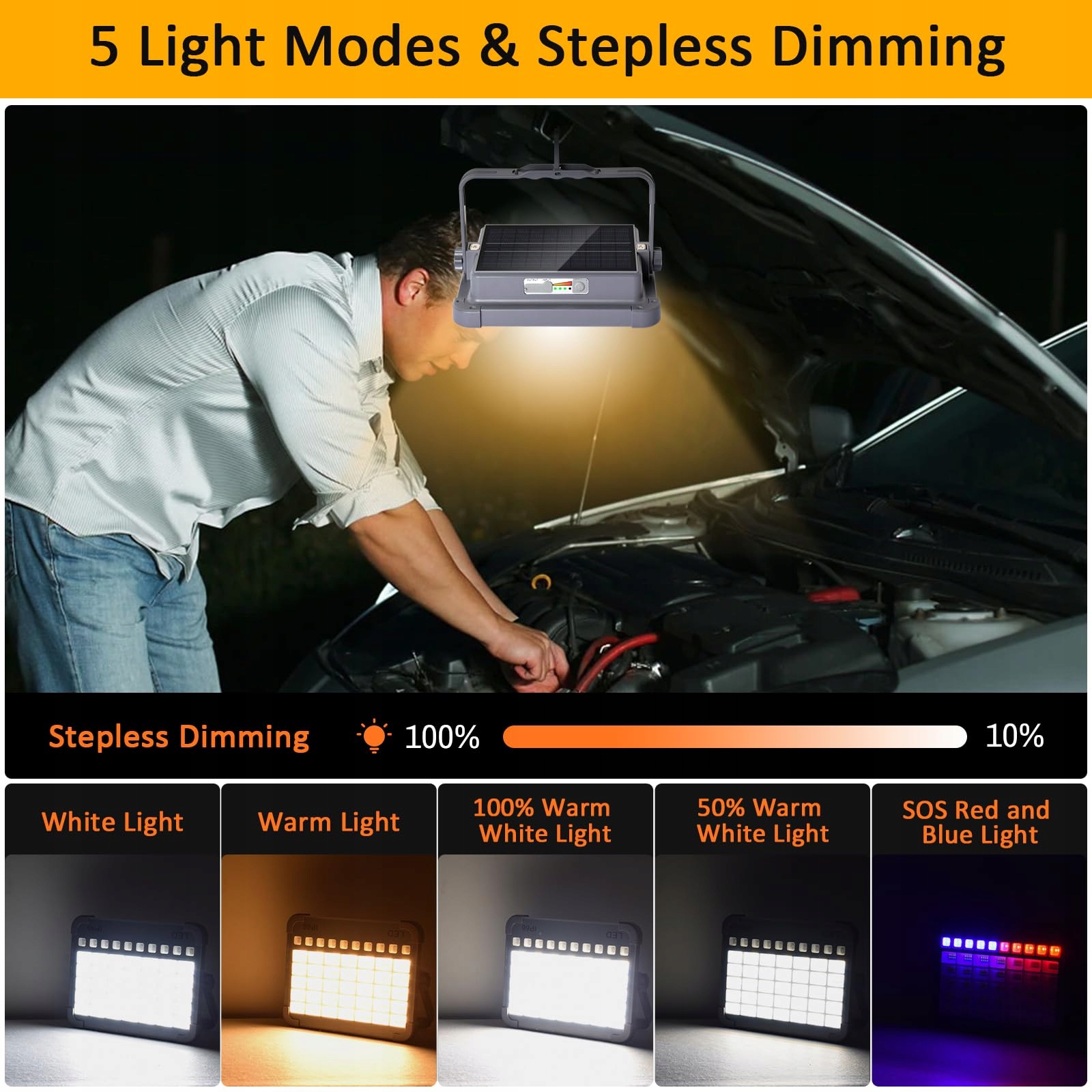 【ODPOWIEDNI DO UŻYTKU WEWNĘTRZNEGO I ZEWNĘTRZNEGO】: Solarne lampy robocze LED nadają się do kempingu, sytuacji awaryjnych, wędkowania, grillowania, naprawy pojazdów, warsztatów, garaży, różnych środowisk pracy takich jak magazyny, ogrody, wędrówki, oświetlenie sklepów i podwórek oraz wiele innych działań wewnętrznych lub zewnętrznych.