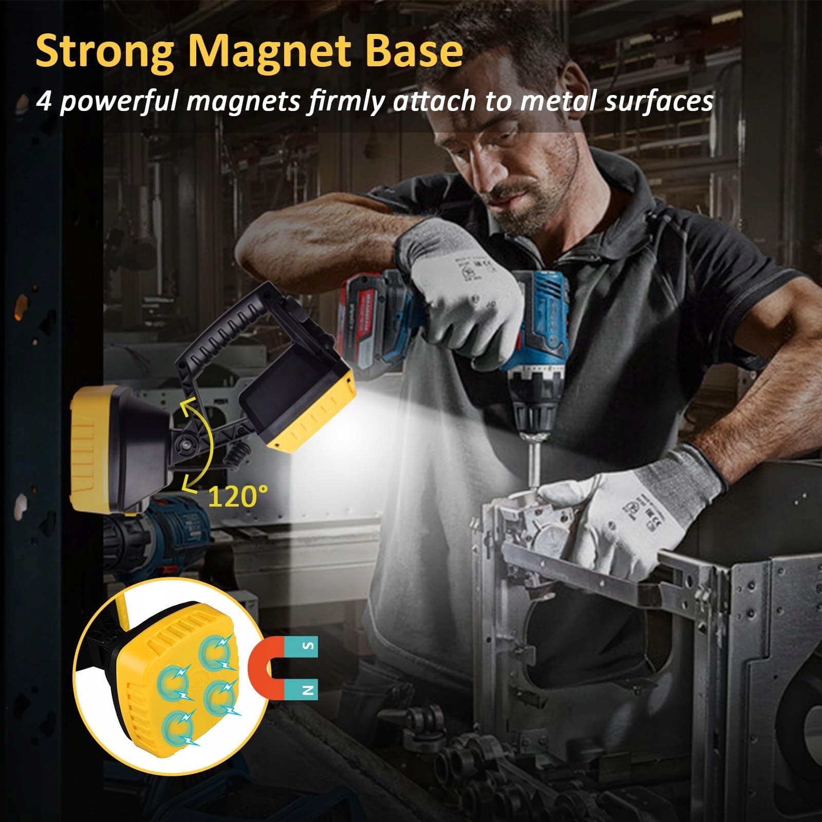 【SILNY MAGNETYCZNY PODSTAWA & HAK】: Nasze reflektory na baterie są wyposażone w 4 potężne wbudowane magnesy, które przyczepiają się do metalowych powierzchni, zapewniając tymczasowe oświetlenie. Projekt haków pozwala zawiesić przenośną lampę kempingową na Twoim namiocie. Obrót o 120 stopni zapewnia oświetlenie pod wieloma kątami, aby sprostać różnym wymaganiom.