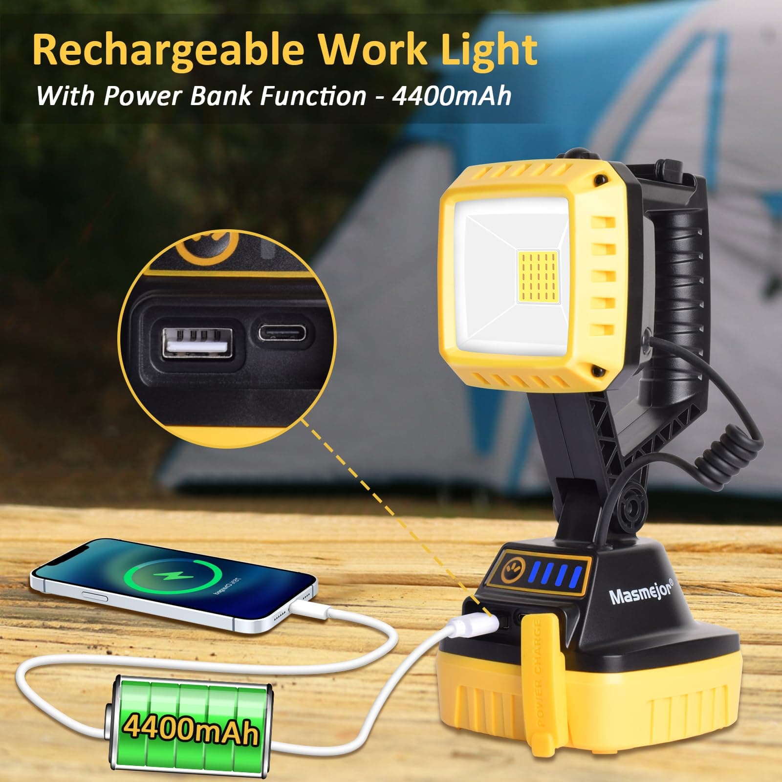 MASMEJOR Reflektor na baterie 1500LM, LED lampa robocza akumulatorowa z baterią 4400mAh - IP44, obrót o 150°, 3 poziomy jasności dla warsztatu, naprawy samochodów, kempingu, ogrodu, awarii zasilania