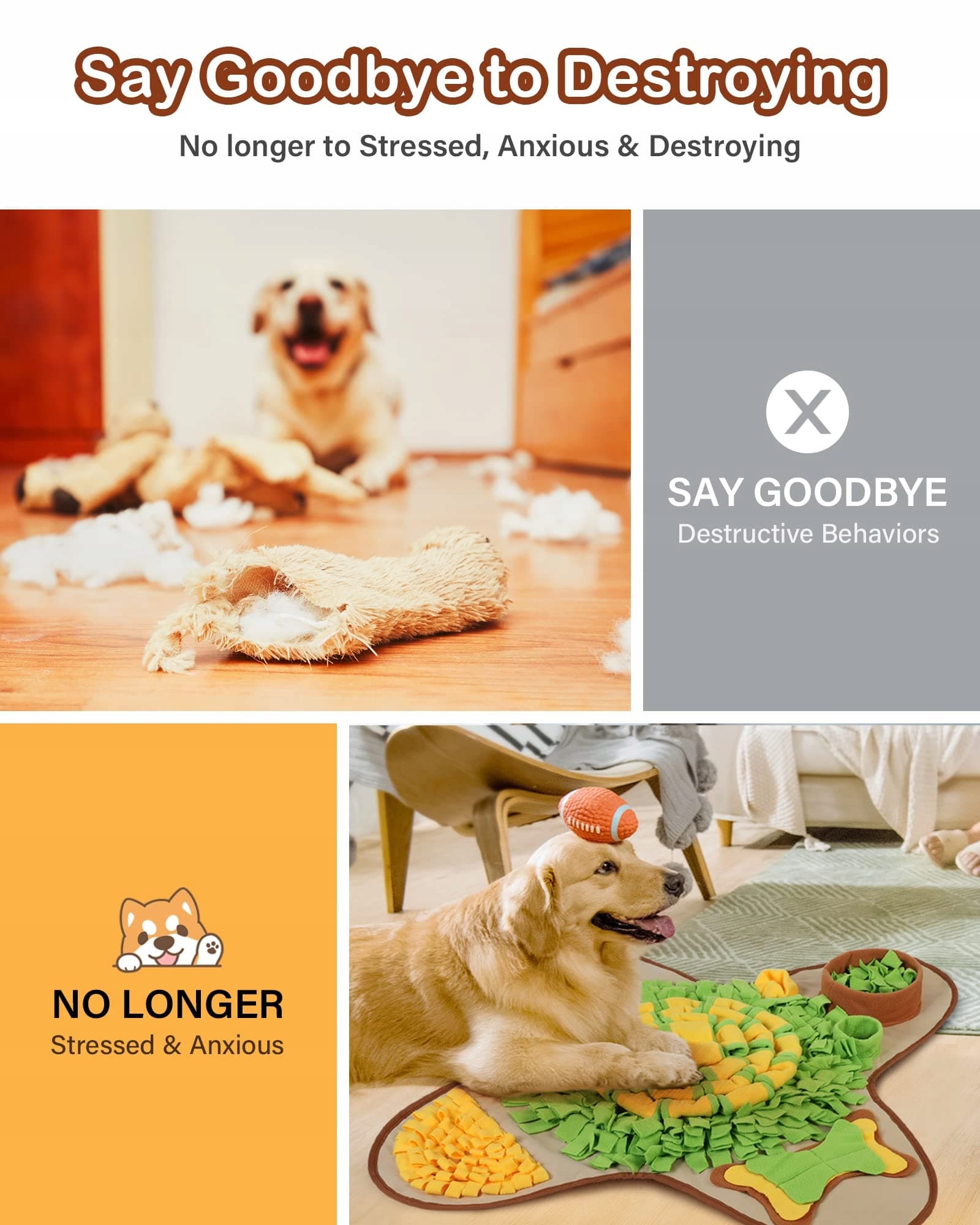 Zredukuj stres i lęk swojego psa – nasz sznuflowy dywanik wspiera naturalne zachowania poszukiwania jedzenia, co pomaga zmniejszyć stres i lęk u psów. Sukces w wykonywaniu zadań pomaga psom budować pewność siebie i sprawia, że są mniej skłonne do wykazywania nerwowych zachowań, takich jak gryzienie dywanu.