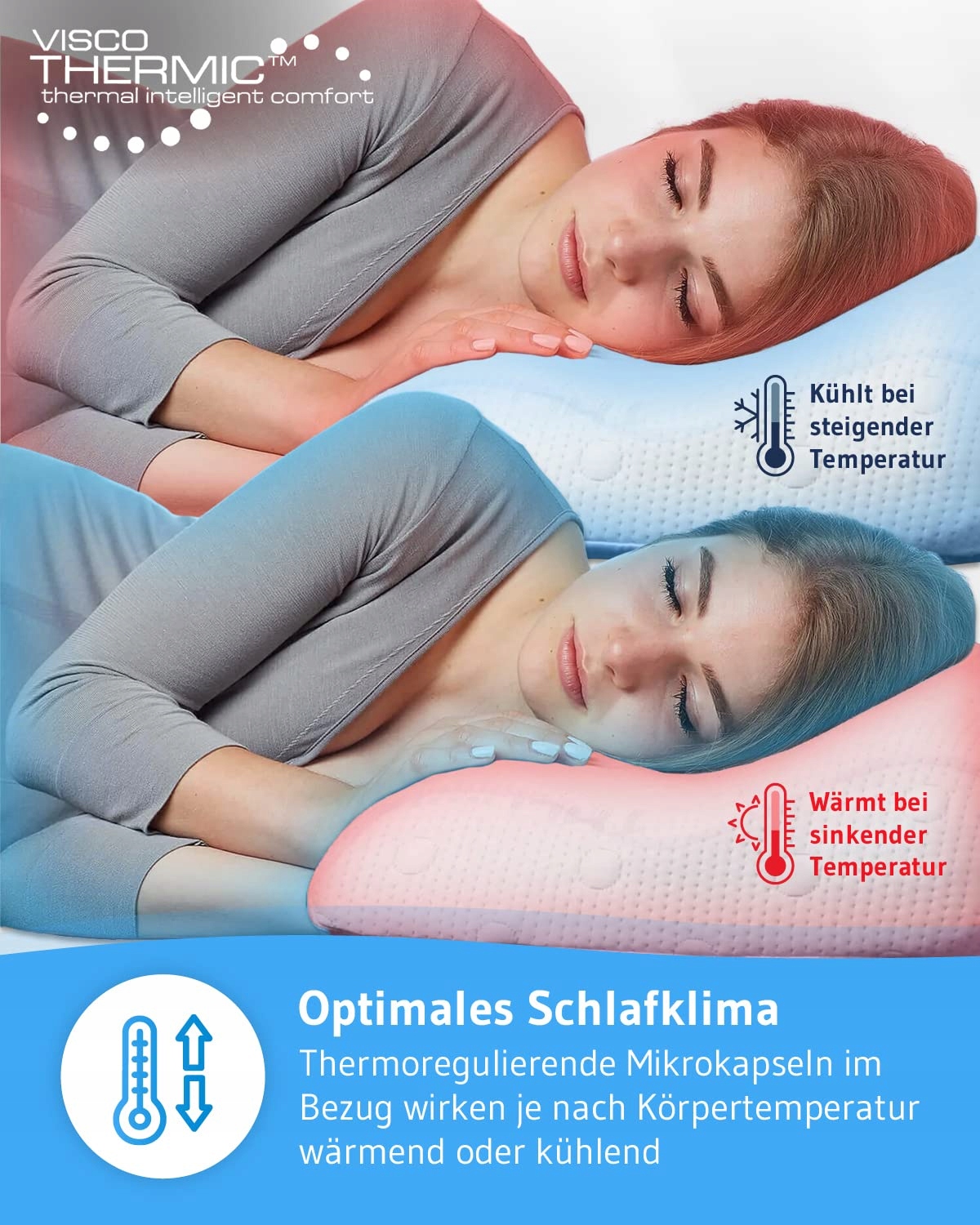 ➤ ZARZĄDZANIE CIEPŁEM I WILGOTNOŚCIĄ: Termoregulujące mikrokapsułki w specjalnym pokrowcu Thermic oraz kanały wentylacyjne w poduszce zapewniają optymalną wentylację, idealne zarządzanie temperaturą i utrzymują zdrowy mikroklimat podczas snu. Oznacza to dla Ciebie mniej pocenia się i marznięcia w czasie snu