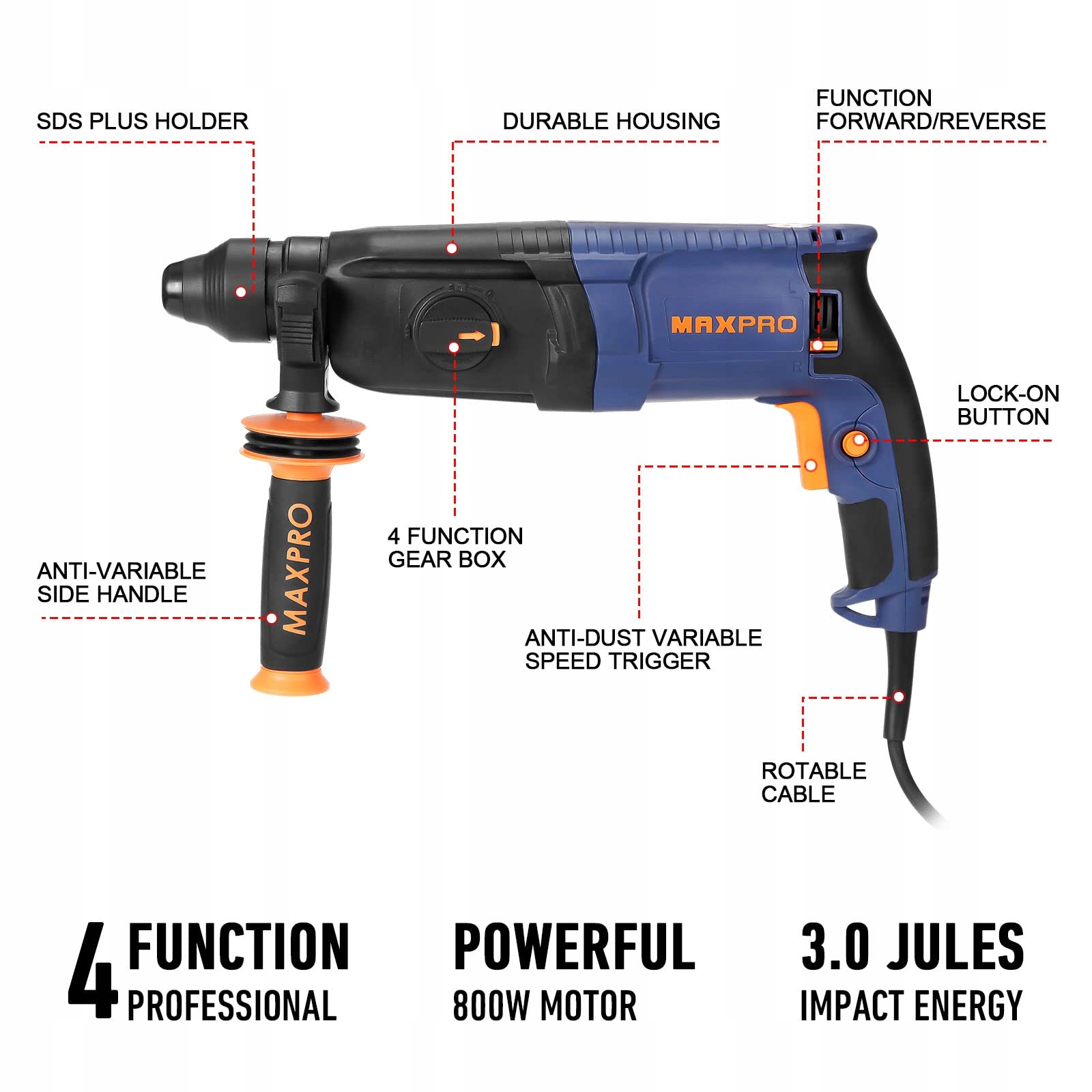 MAXPRO Młotowiertarka SDS-Plus 28J 4 Funkcje Wiertła Dłuta Zestaw