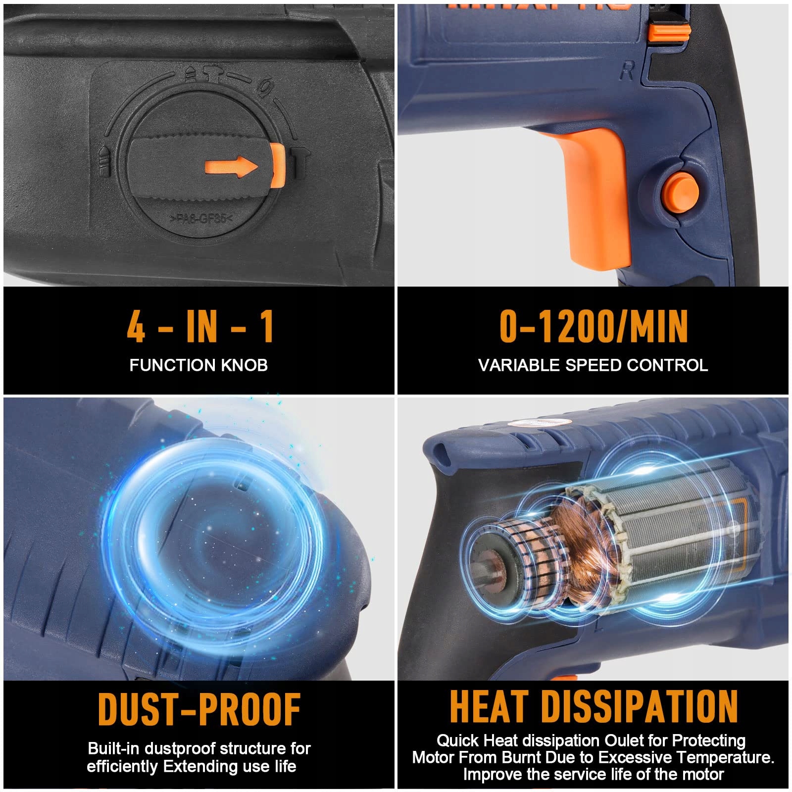 Wysoka moc i wydajność. Silnik 800 W z energią uderzenia 2,8 Jouli, 0-4900BPM i 0-1100rpm jest optymalny do realizacji różnych projektów. Dzięki 6-stopniowej regulacji prędkości można łatwo kontrolować narzędzie w każdej chwili. Możesz nacisnąć przycisk blokady, aby utrzymać prędkość, bez konieczności ciągłego trzymania przycisku zasilania, aby uniknąć zmęczenia palców.
