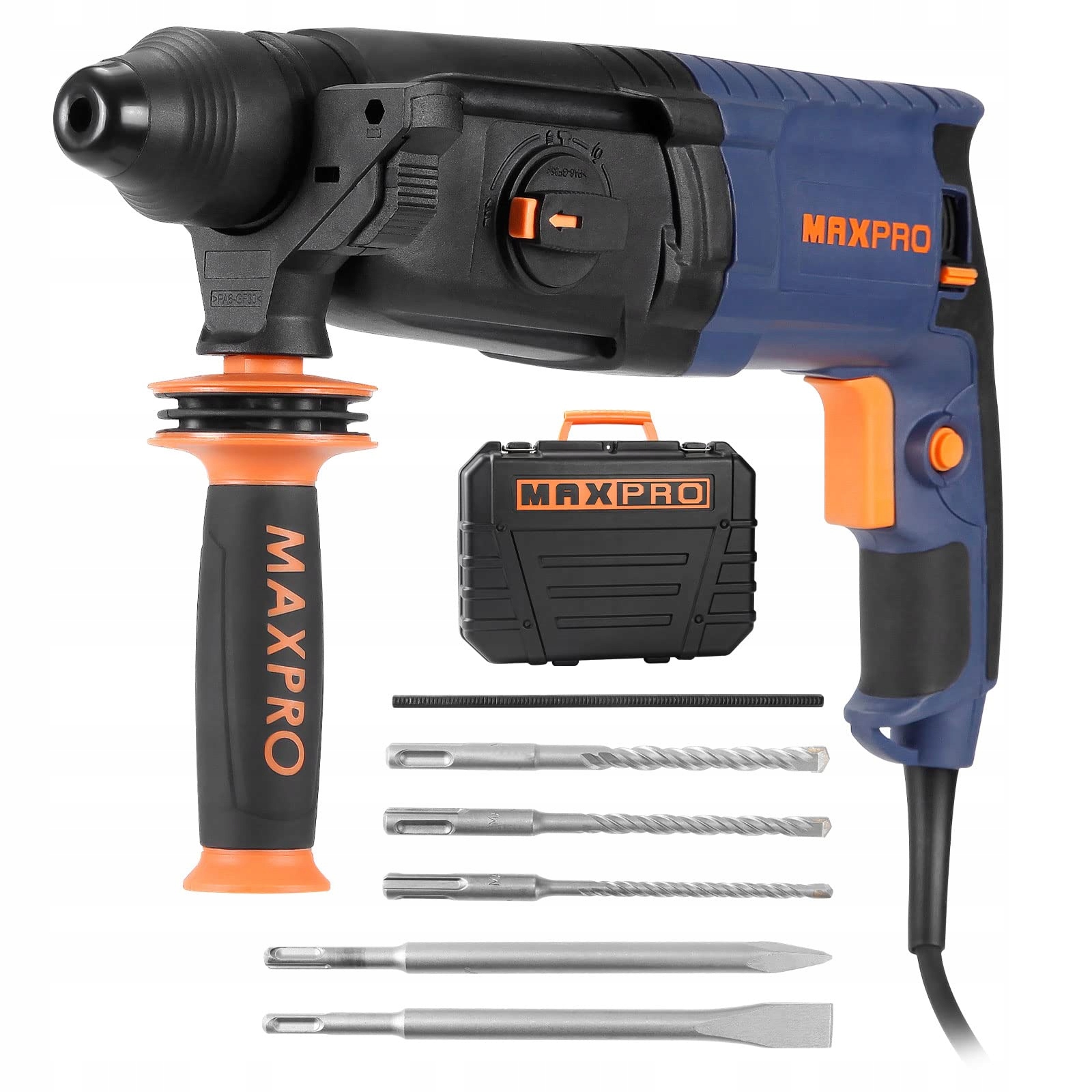 MAXPRO młotowiertarka SDS-Plus 2,8J, 4 funkcje, zdolność wiercenia: beton (26 mm), metal (13 mm), drewno (30 mm), 3 wiertła, 2 dłuta i pudełka w zestawie