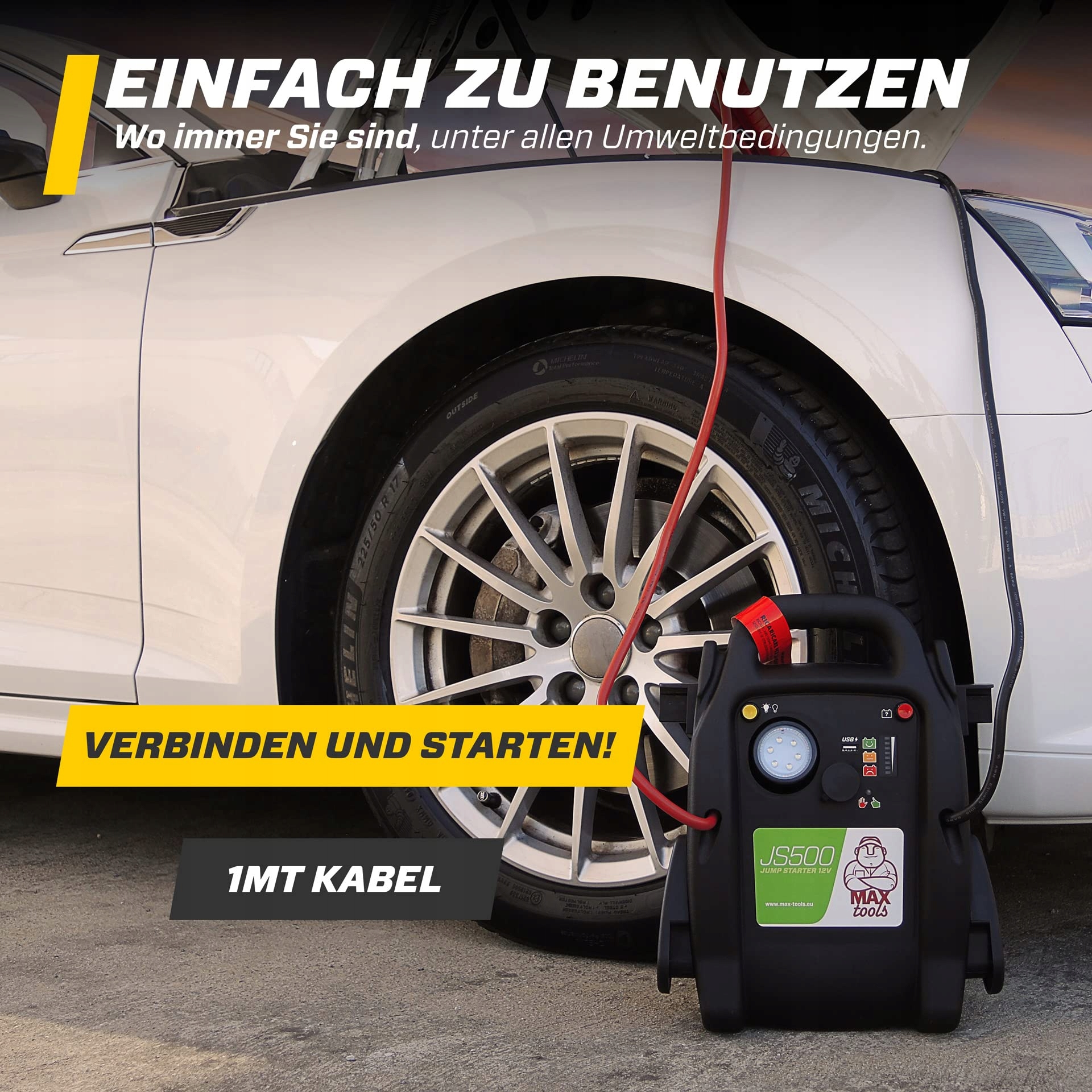 MAXTOOLS JS500 2200A 22Ah, UltraSafe Starthilfe Powerbank, dla samochodów i furgonetek, do silników diesla i benzynowych 12V, rozrusznik z lampą LED, złączem USB i kablami do rozruchu