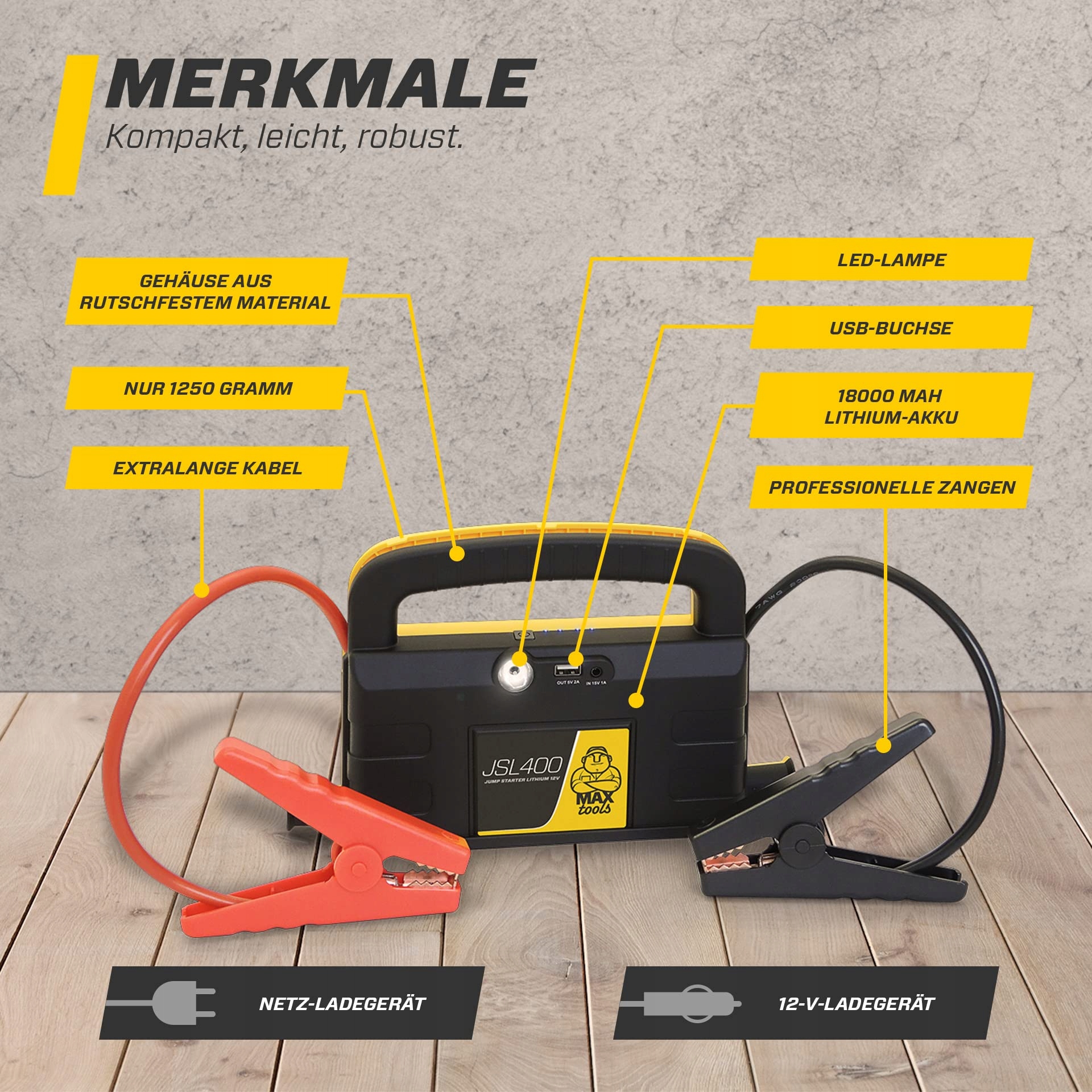 MOCNY: Model JSL400 jest idealny do awaryjnego uruchamiania każdego samochodu i pojazdu użytkowego z akumulatorem 12 V; Jego pojemność 18000 mAh (66,6 Wh) umożliwia wielokrotne uruchamianie pojazdów z rozładowanym akumulatorem, zanim będzie musiał zostać naładowany; Funkcja boost dla pojazdów bez akumulatora