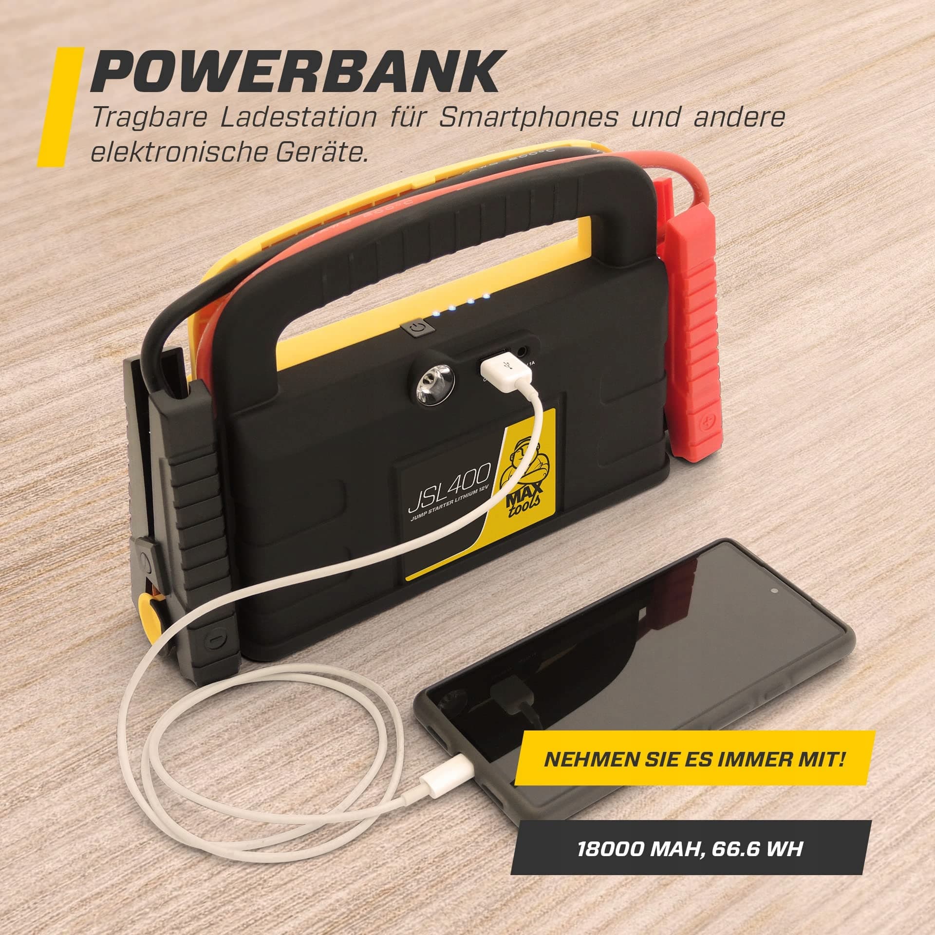 MAXTOOLS JSL400, profesjonalny 2400-A litowy rozrusznik awaryjny dla dużych pojazdów z silnikiem diesla i benzynowym 12 V, mocny i bezpieczny booster 12 V, powerbank z USB i kablem rozruchowym, 800A