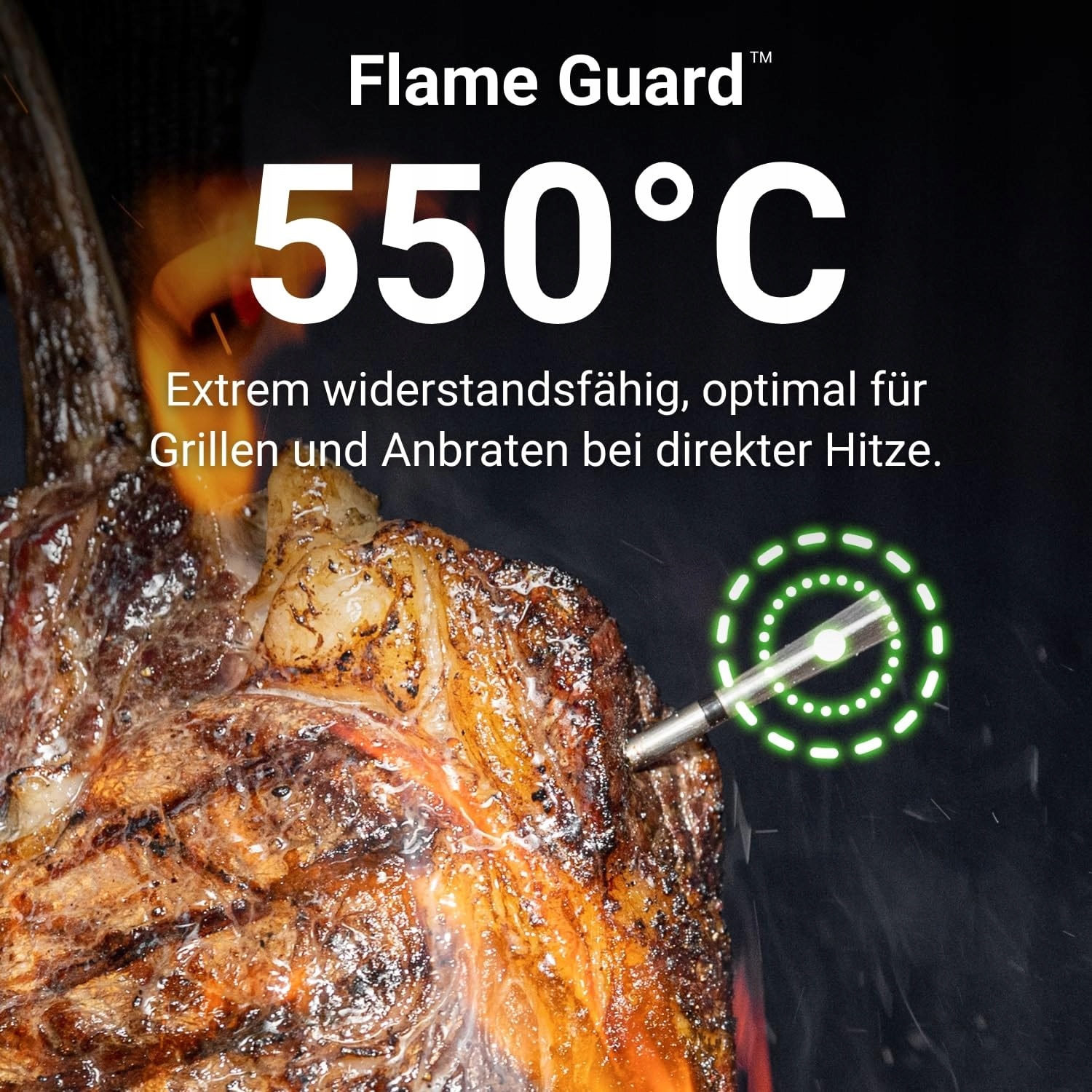 JESZCZE BARDZIEJ ODPORNY: Nowy czujnik temperatury w pełni metalowy może być używany w temperaturach otoczenia do 550°C, co otwiera jeszcze więcej możliwości zastosowania. Żaden inteligentny termometr do mięsa nie wytrzymuje więcej!