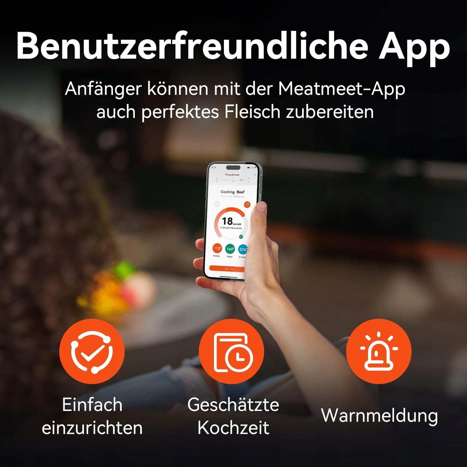 Łatwa i intuicyjna obsługa: Towarzysząca aplikacja z obsługą języka niemieckiego oferuje wstępnie ustawione profile temperatury, funkcje alarmowe i zalecane stopnie gotowania. Dzięki zintegrowanym instrukcjom krok po kroku, idealne gotowanie udaje się nawet początkującym bez trudu.