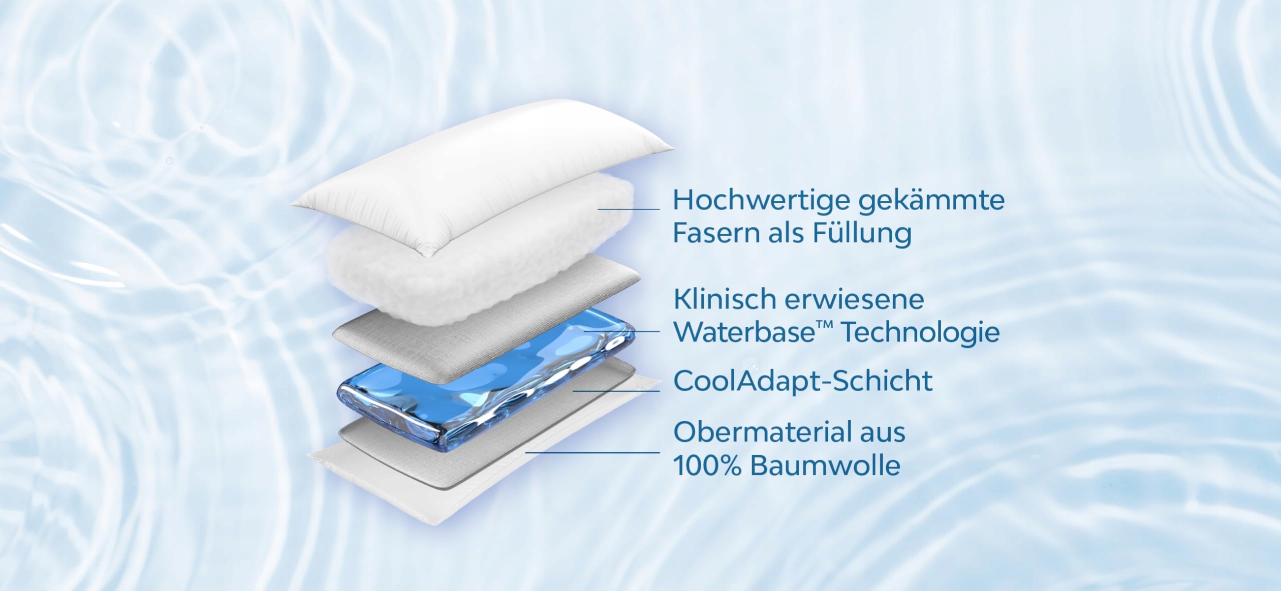 Ortopedyczna poduszka pod głowę i szyję z miękkim wypełnieniem z włókien i regulowanym wkładem wodnym, wspiera relaksujące zasypianie i pomaga przy dolegliwościach szyi (potwierdzone w badaniu klinicznym). Odpowiednia dla osób śpiących na plecach, boku i brzuchu