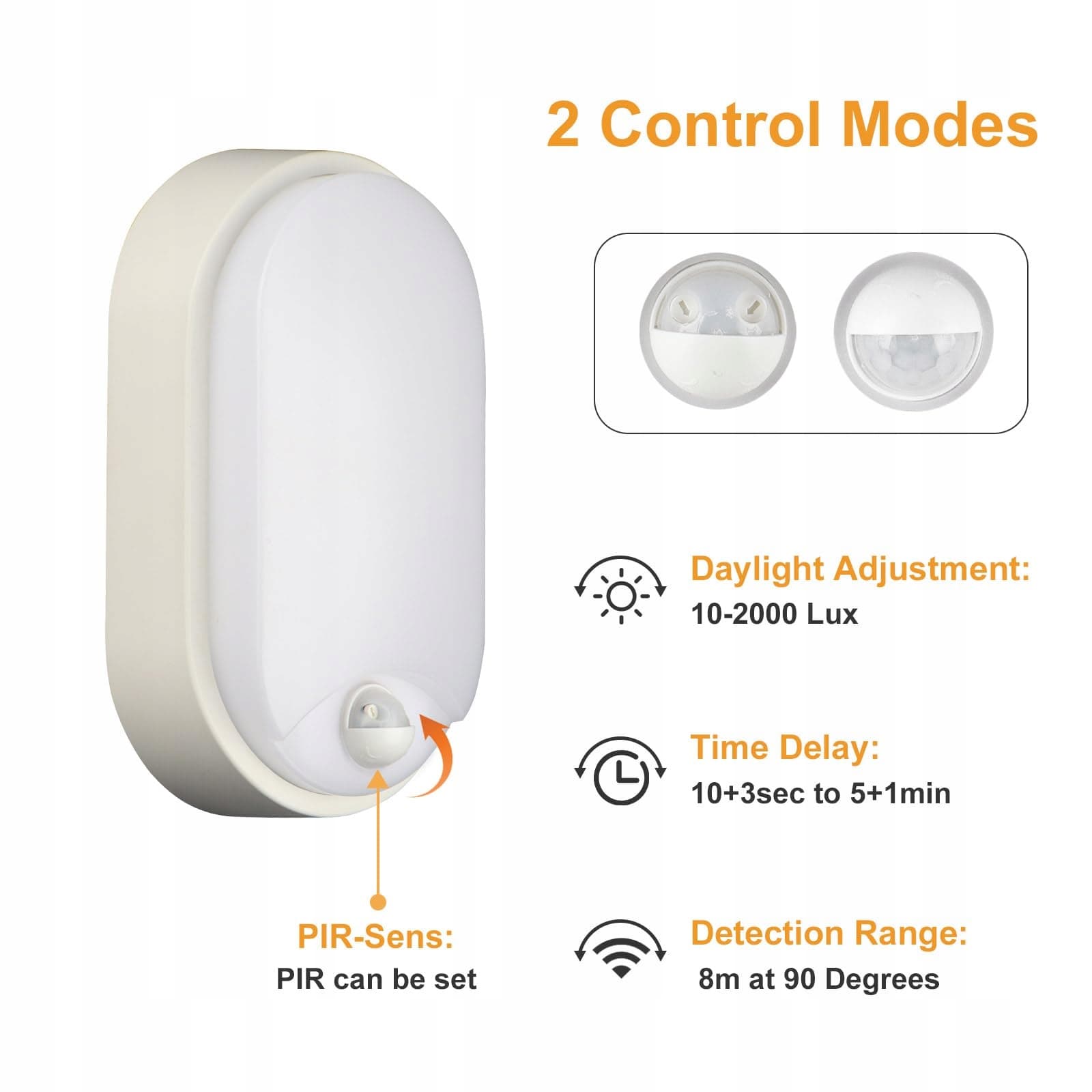【Czujnik ruchu PIR】Wysokoprecyzyjny czujnik ruchu PIR pozwala, aby lampa LED włączała się tylko wtedy, gdy wykryje osobę lub poruszający się obiekt. Zasięg wykrywania: 8 m przy 90 stopniach, ustawienie światła dziennego: 10-2000 luksów, opóźnienie czasowe: 10+3 sekund do 10+3 minut