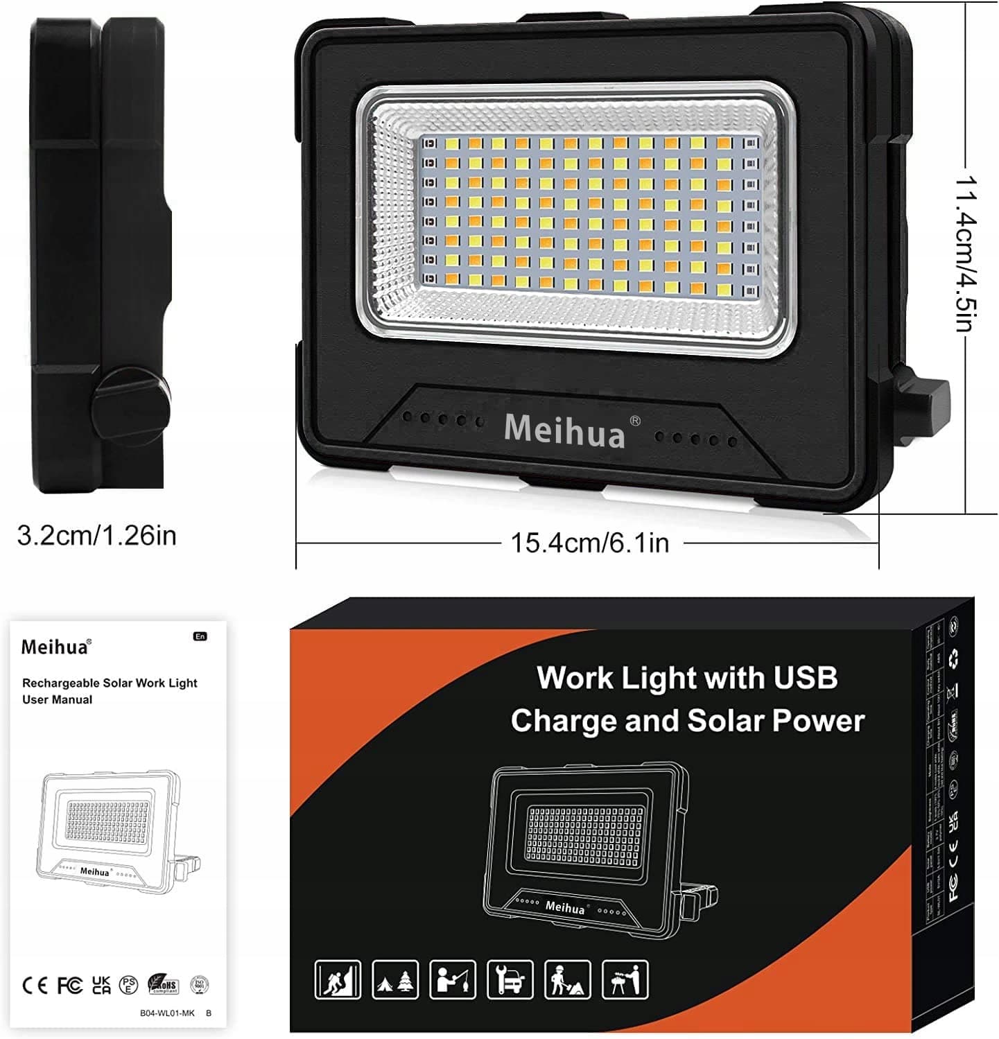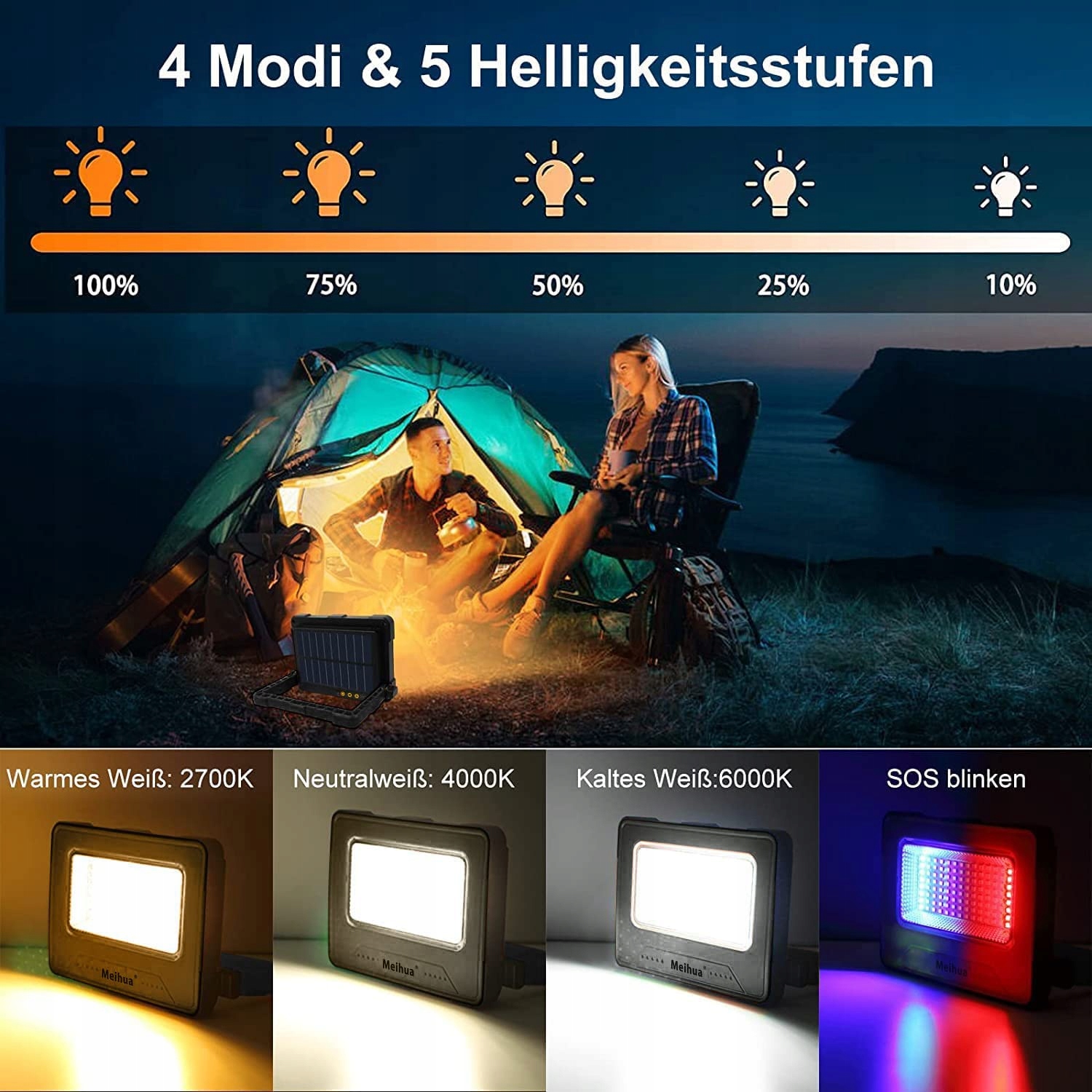MEIHUA 60W LED Reflektor Akumulator 12000mAh LED Reflektor Wodoodporny Przenośna Lampa Solarna USB Ładowalna 4 Tryby Światła 5 Poziomów Jasności do Budowy, Warsztatu, Kempingu, Awarii