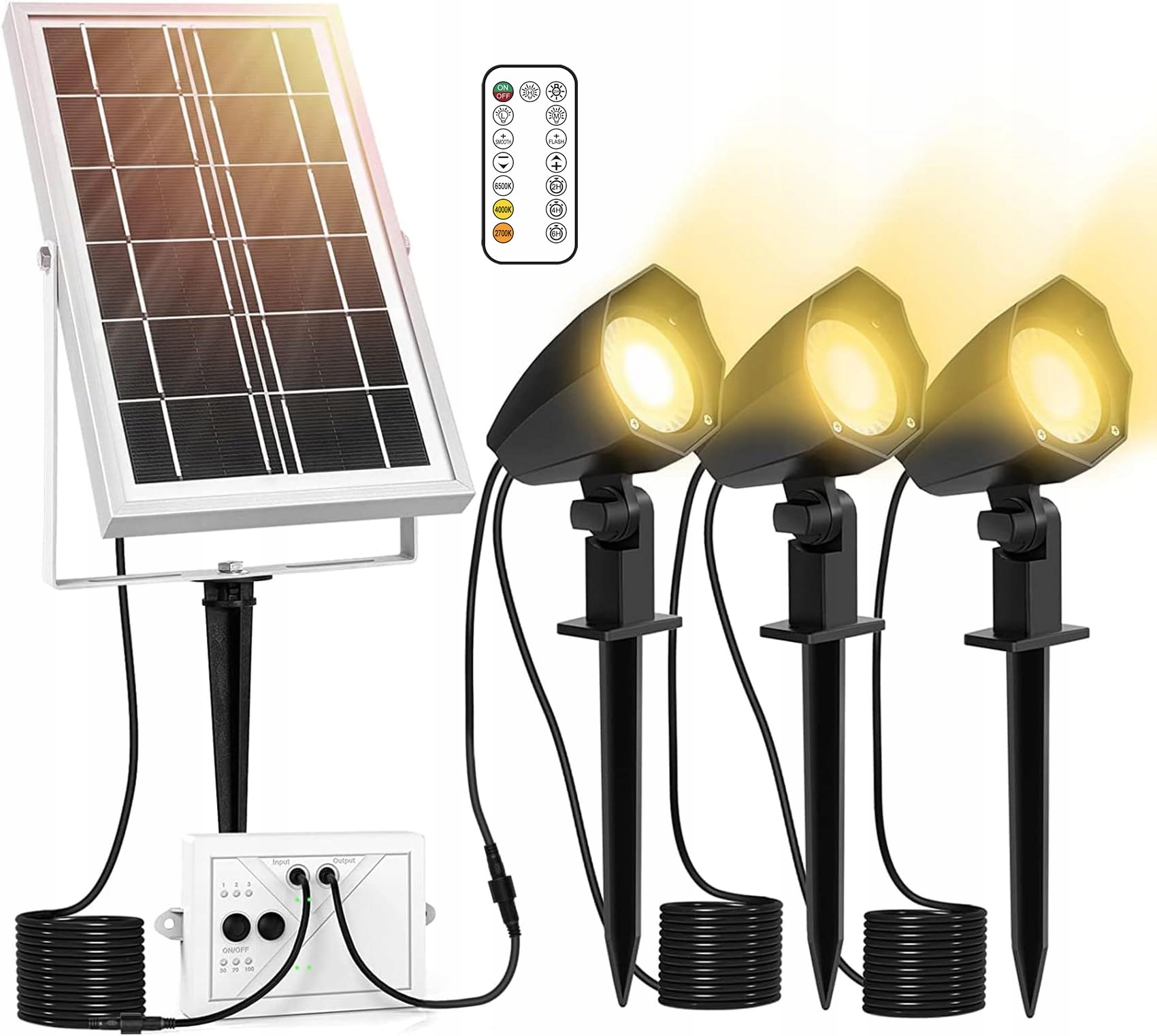Długi Kabel: Panel solarny z kablem o długości 4,5 m, kabel 3 m między dwoma lampami, wystarczająco długi, aby umieścić panel solarny w miejscu, gdzie otrzyma wystarczająco dużo światła słonecznego, aby oświetlić potrzebny obszar. Lampka kontrolna na skrzynce baterii pozwala jasno zobaczyć tryb i poziom mocy.