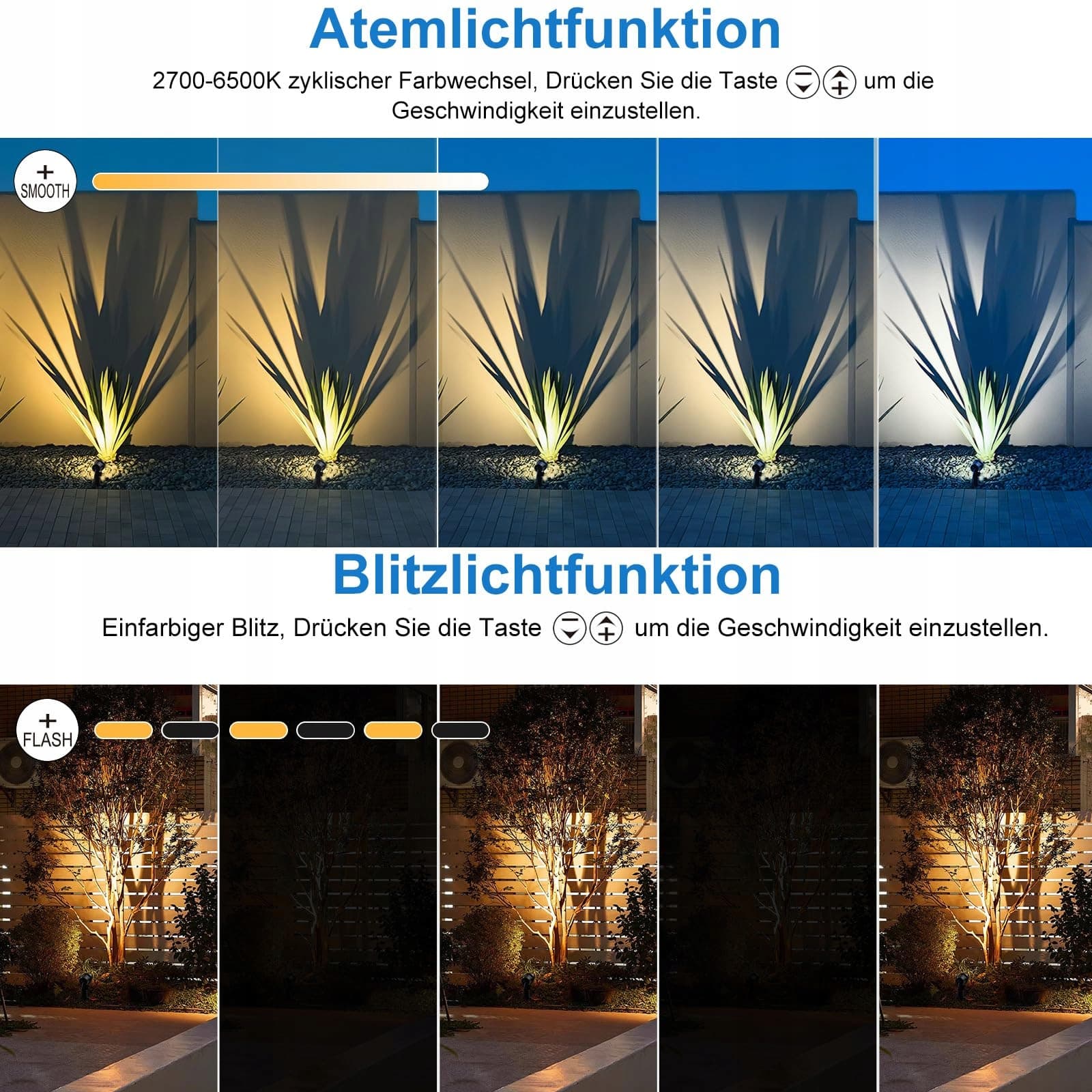 2 Rodzaje Trybów Dynamicznych: Solarne lampy ogrodowe mają dwa rodzaje trybów dynamicznych: SMOOTH i FLASH. Tryb SMOOTH to cykl kolorów o temperaturze barwowej 2700K-6500K, a FLASH to miganie pojedynczej temperatury barwowej. Możesz nacisnąć '+/-', aby dostosować prędkość. Tryb dynamiczny nadaje Twojemu ogrodowi ciepłą i żywą atmosferę.