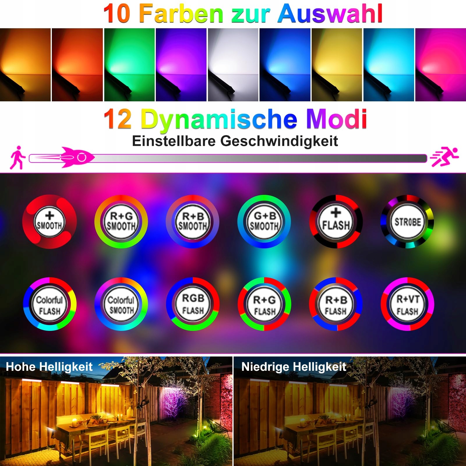 10 kolorów, 12 trybów, 2 poziomy jasności, szerokie zastosowanie: Pasek LED aktualizuje pilot zdalnego sterowania i ciesz się większą ilością funkcji, posiada 10 stałych pojedynczych kolorów, tryb statyczny lub dynamiczny może być ustawiony (SMOOTH/FLASH). 12 cyklicznych trybów kolorów: jednokolorowy SMOOTH lub FLASH, wielokolorowy SMOOTH lub FLASH pętle. Prędkość jest regulowana. Reflektor LED Wallwasher Światło imprezowe ma 2 poziomy jasności: wysoka-niska jasność. Dobry wybór na imprezy, wesela, sceny, hotele, ogrody, oświetlenie krajobrazowe, festiwale lub dekoracje świąteczne.