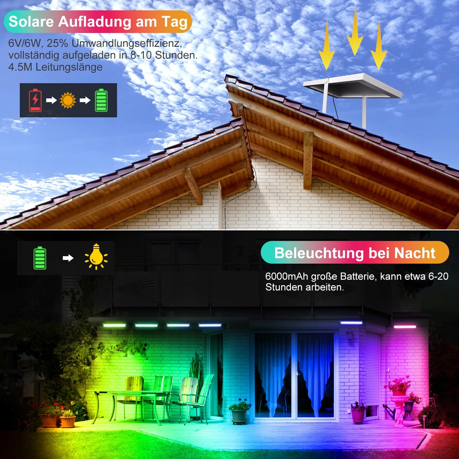 Szybkie ładowanie, oszczędność energii: Ulepszone reflektory RGB LED są ładowane energią słoneczną, co oszczędza energię. Wyposażony w wydajny panel słoneczny 6V/6W, LED Wallwasher Światło może osiągnąć współczynnik konwersji do 25% i 8-10 godzin może wystarczyć do magazynowania energii. Akumulator o dużej pojemności 6000mAh, aby świecić przez 8-12 godzin po pełnym naładowaniu. RGB LED Lightbar są dostarczane z oddzielnym panelem słonecznym i 4,5m kablem połączeniowym, moduły słoneczne mogą być ustawione w bezpośrednim świetle słonecznym.