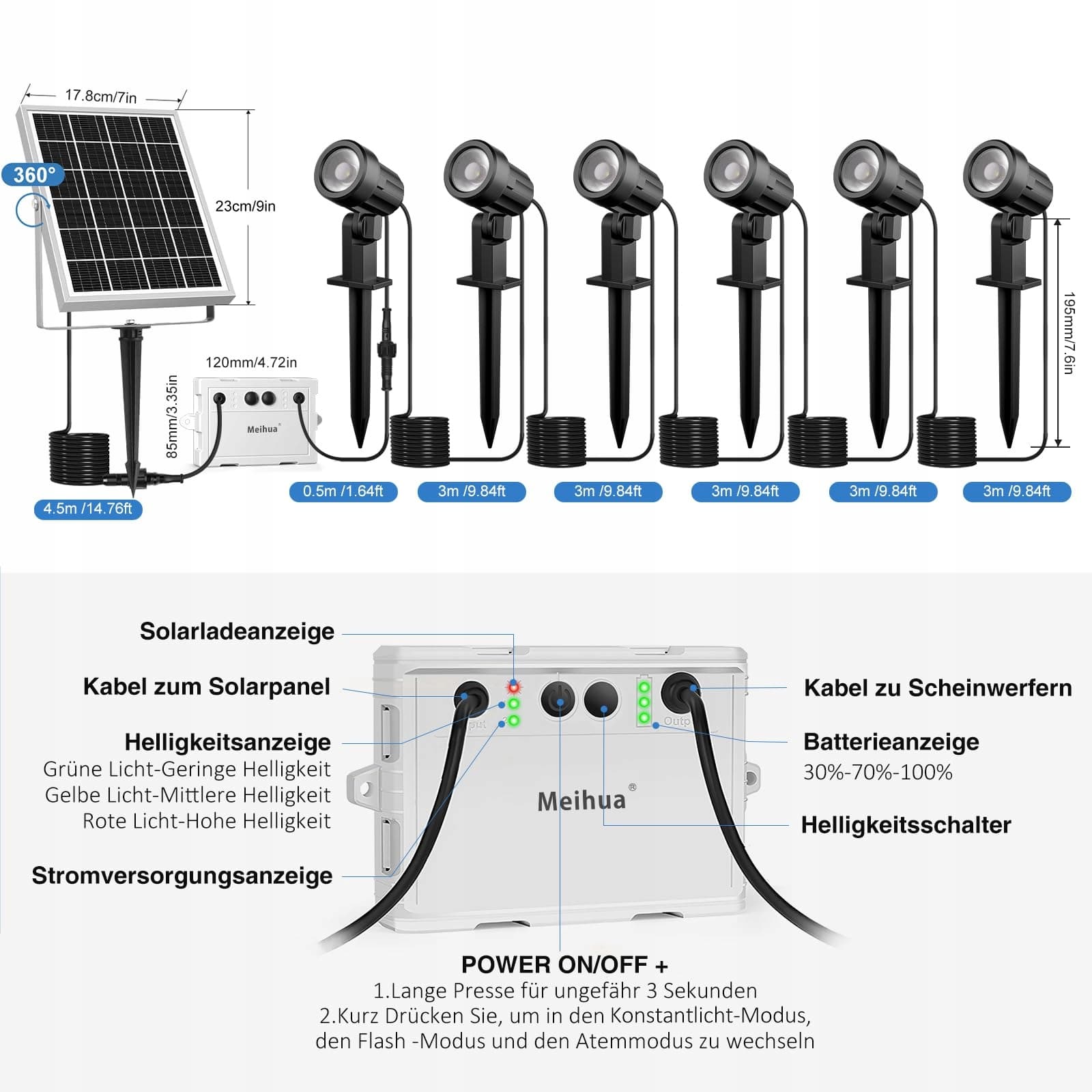 [Regulowane Oświetlenie Ogrodowe]: Głowica lampy ogrodowej może być obracana do 180°, co umożliwia indywidualne ustawienie. Kąt panelu solarnego można ręcznie ustawić na 360°. Nasze lampy solarne na zewnątrz są wyposażone w kołki i kabel o łącznej długości 18 metrów, dzięki czemu można je montować nie tylko na dachu, ścianie, drzewie, dachu, ale także stabilnie na miękkim podłożu, takim jak trawa.
