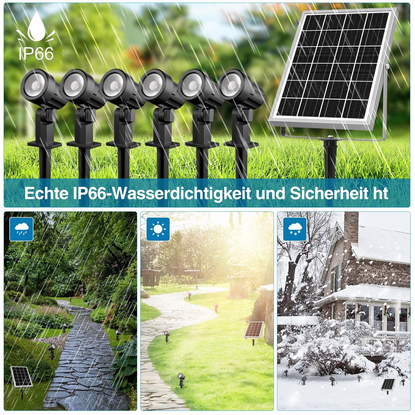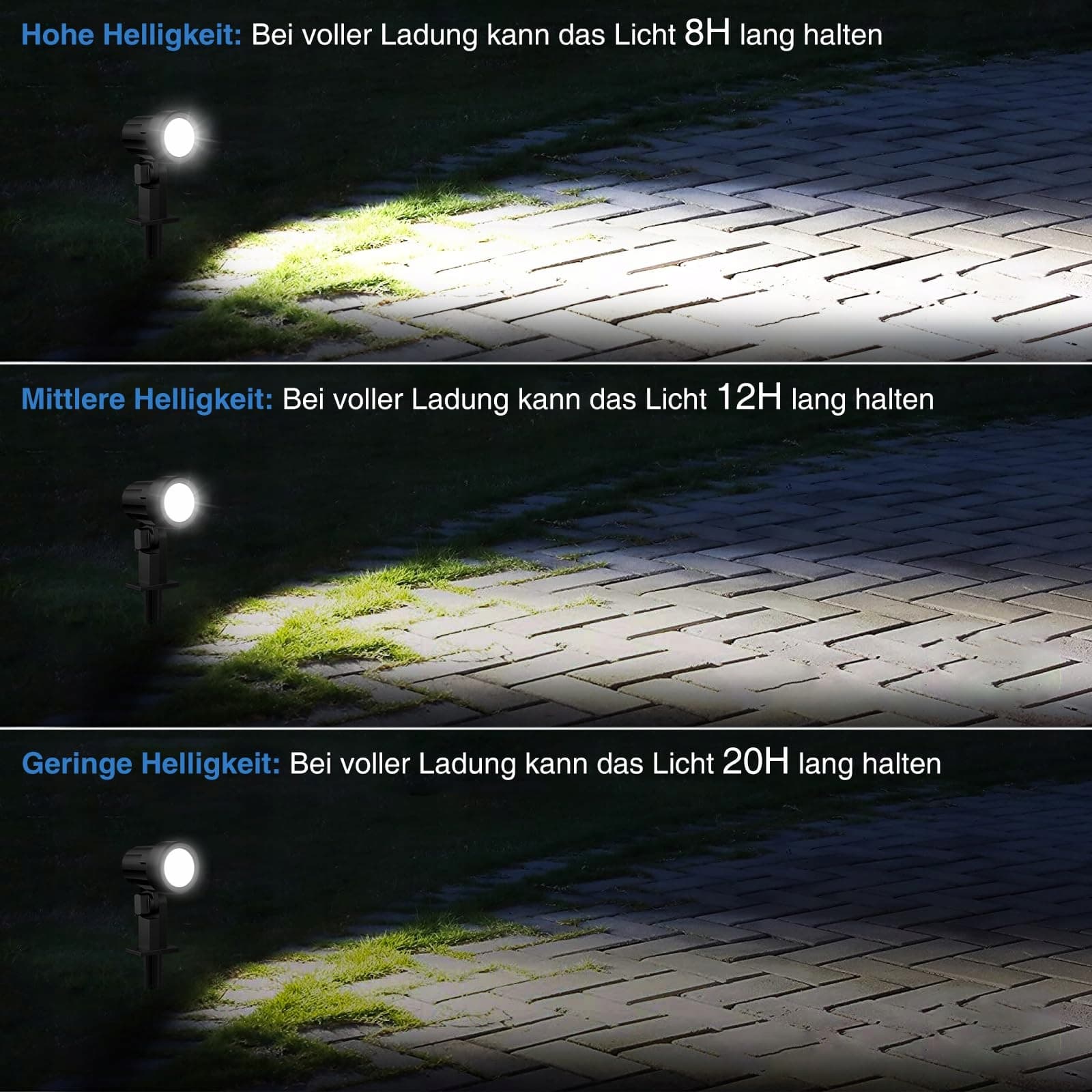 [Superjasny IP66 Wodoodporny Reflektor Solarny]: Mocne lampy solarne emitują skupione oświetlenie na miękkim podłożu. Dzięki odpornej na warunki atmosferyczne obudowie, lampa ogrodowa jest chroniona przed wilgocią i kurzem, stabilna i trwała. Złącze śrubowe na połączeniu kablowym lampy solarnej całkowicie uniemożliwia dostęp wody.