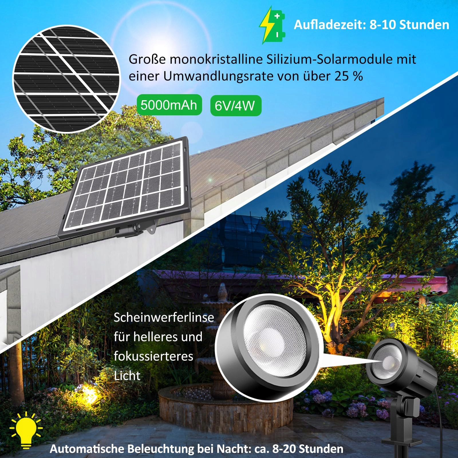 IP66 Wodoodporne i 2 Sposoby Montażu: Solarne oświetlenie LED z specjalnym wodoodpornym złączem do połączenia panelu solarnego i reflektora zewnętrznego. IP66 wodoodporne, stabilne przez cały rok, zaprojektowane do użytku na zewnątrz. Wbijane w ziemię lub montowane na ścianie, łatwe do zainstalowania