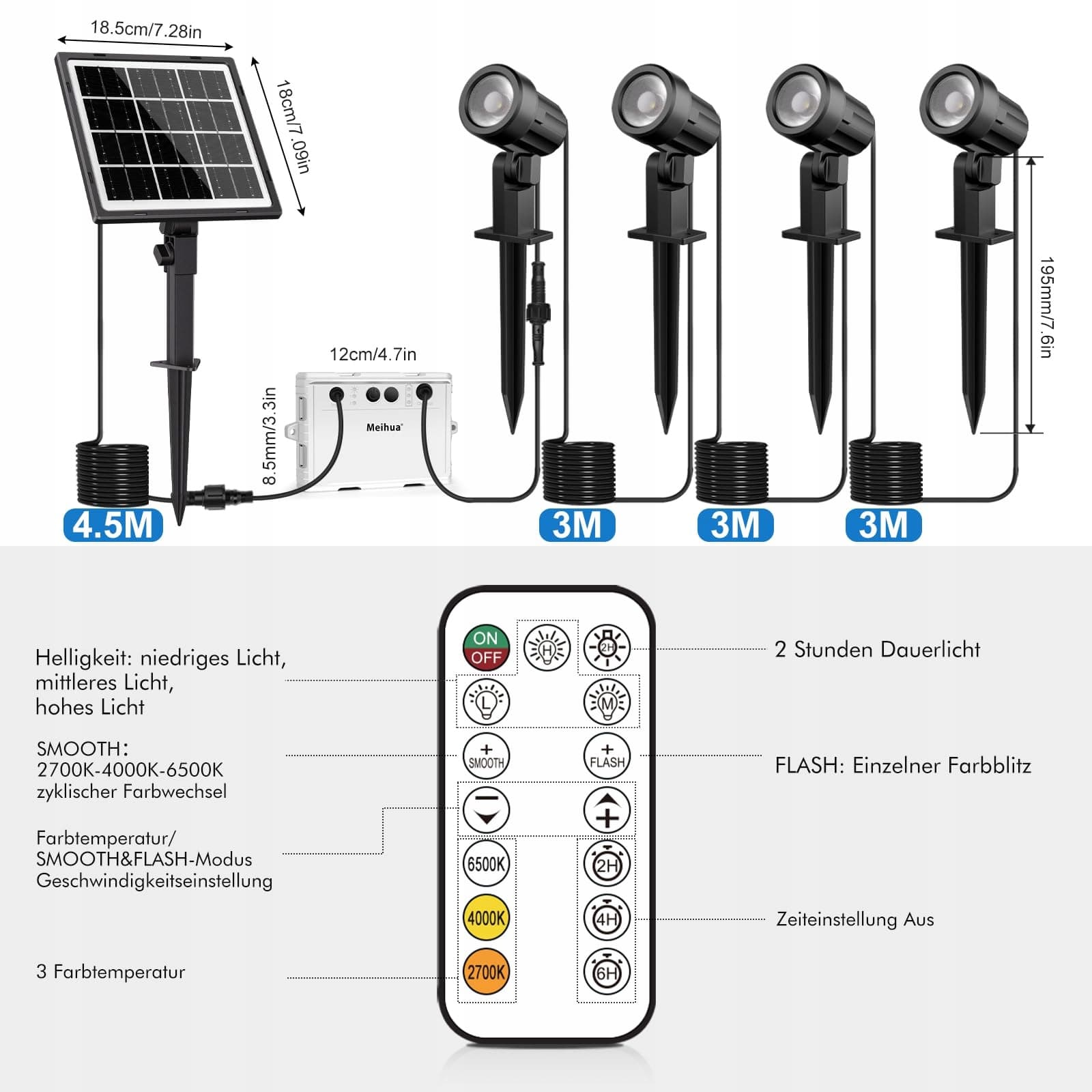 MEIHUA Solarne Reflektory LED Lampy Solarne na Zewnątrz 4 Sztuki, Solarne Oświetlenie Ogrodowe IP66 Wodoodporne z Pilotem, 3Jasności 2Tryby Regulowane 2700K-6000K do Ogrodów Krzewów Drzew i Ścieżek