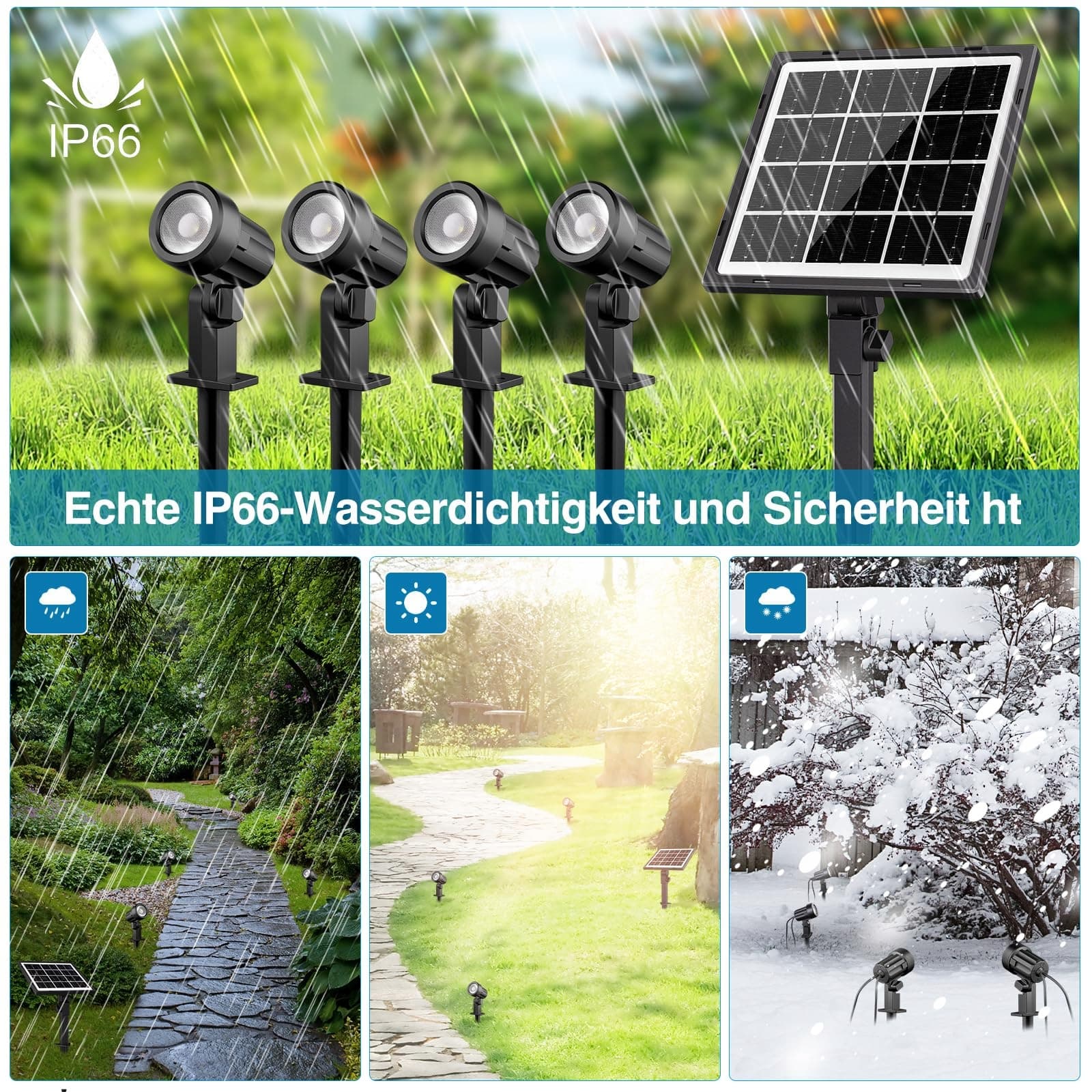 [IP66 Wodoodporny Reflektor Solarny]: Mocne lampy słoneczne emitują skupione oświetlenie na miękkim podłożu. Dzięki wodoodpornej obudowie lampa ogrodowa jest chroniona przed wilgocią i kurzem, stabilna i trwała. Złącze śrubowe na kablu lampy słonecznej całkowicie uniemożliwia dostęp wody.