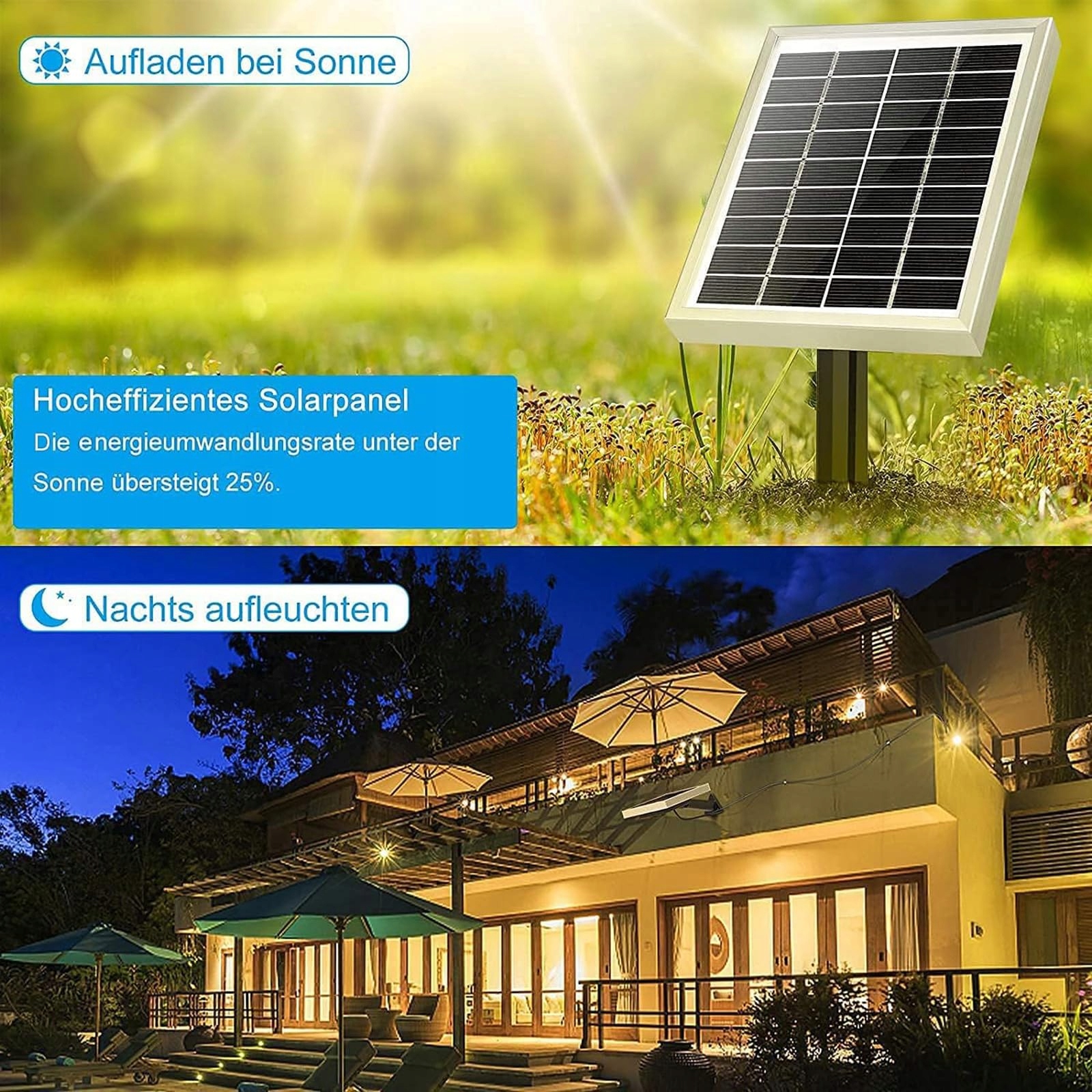 IP66 wodoodporność i 2 sposoby montażu: LED-solarna lampa z specjalnym wodoodpornym złączem do połączenia panelu słonecznego i zewnętrznego reflektora. IP66 wodoodporność, stabilna przez cały rok, zaprojektowana do użytku na zewnątrz. Wbij w ziemię lub zamontuj na ścianie, łatwa w instalacji.