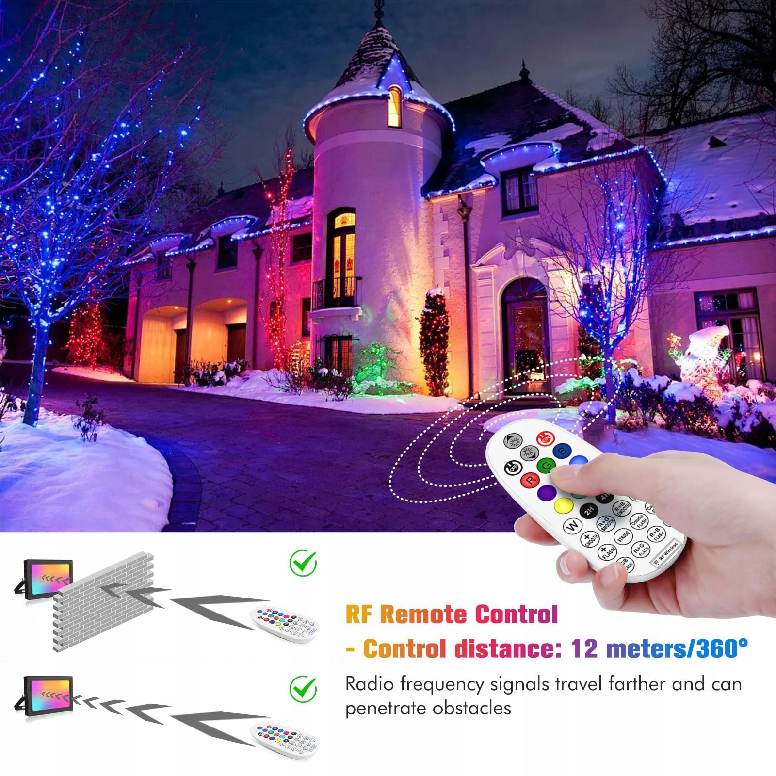 360-stopniowy pilot, zasięg pilota 12 m: reflektor RGB z pilotem można sterować za pomocą dołączonego pilota (zasięg sterowania wynosi 12 m). Nowo ulepszony pilot może sterować światłem na 360 stopni, co oznacza, że nie musisz celować bezpośrednio w przód światła podczas korzystania z reflektora LED RGB, co jest wygodniejsze dla Ciebie