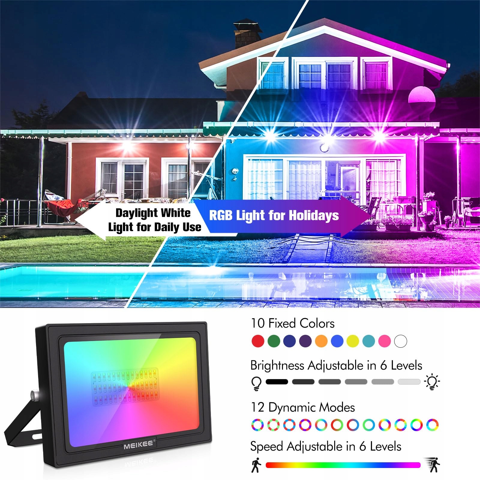 Wodoodporny reflektor RGB na zewnątrz IP66: klasa wodoodporności IP66 zapewnia, że reflektor LED MEIKEE zmieniający kolory działa idealnie w każdych trudnych warunkach, niezależnie od deszczu, gradu czy śniegu. Ten kolorowy reflektor może być szeroko stosowany w oświetleniu zewnętrznym i wewnętrznym. Duży kolorowy reflektor do użytku wewnętrznego i zewnętrznego na imprezy, do ogrodu, na podwórko, scenę, wesele, krajobraz, drzewo, korytarz, werandę, taras itp.