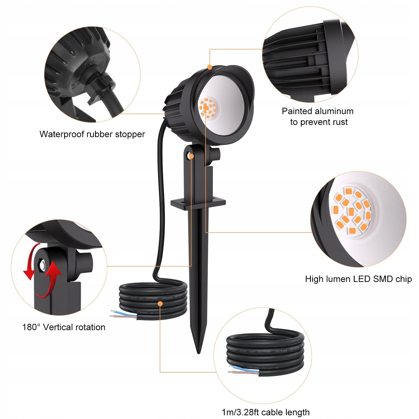 [Wysoka jakość i długa żywotność] Lampa ogrodowa z kolcem wykonana jest z trwałego, odpornego na korozję stopu aluminium, reflektor LED ogrodowy nie rdzewieje łatwo i ma wysoką odporność na promieniowanie UV. Konstrukcja kratki lamp ogrodowych pomaga produktowi szybko odprowadzać ciepło i wydłużać jego żywotność. Te reflektory ogrodowe mają żywotność do 50 000 godzin.