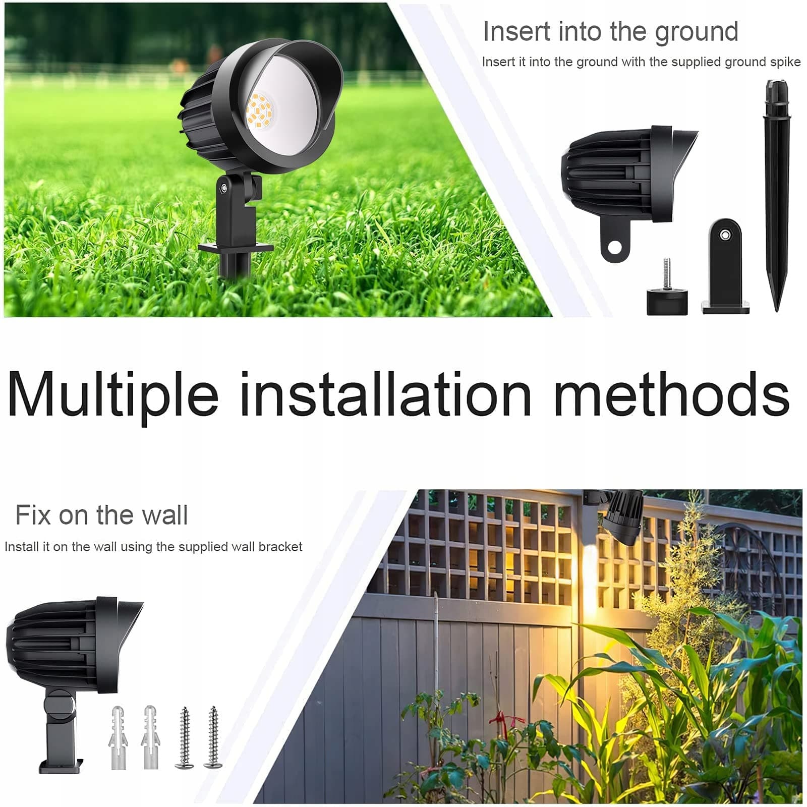 [2 metody instalacji, łatwe do zainstalowania] Montaż na ścianie: Po zamocowaniu uchwytu ściennego i lampy, wbij reflektor LED ogrodowy bezpośrednio w drzewo lub ścianę. Instalacja na ziemi: Po zainstalowaniu gwoździ i lamp wbij oświetlenie ogrodowe na zewnątrz bezpośrednio w trawnik lub nieutwardzoną ziemię. Dzięki dołączonym akcesoriom możesz łatwo samodzielnie zainstalować lampy ogrodowe, bez konieczności zatrudniania elektryka.