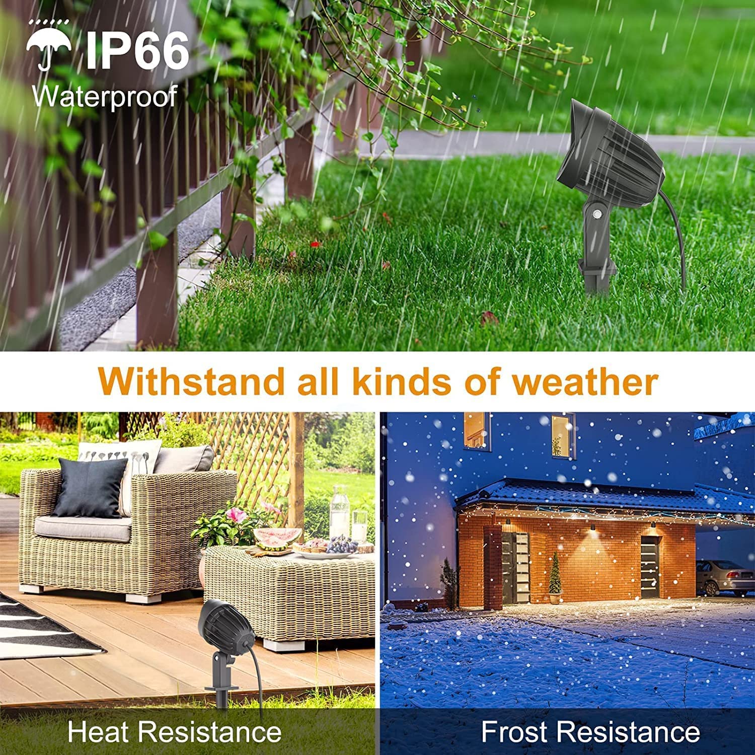 [IP66 wodoodporny, aby wytrzymać wszystkie warunki pogodowe przez cały rok]Lampa ogrodowa wykonana jest z wodoodpornego materiału IP66, a wodoodporny pierścień gumowy na złączu poprawia wodoodporność oświetlenia drzew. Możesz bezpiecznie używać tych świateł ogrodowych na zewnątrz nawet podczas ciężkiej pogody i deszczu.