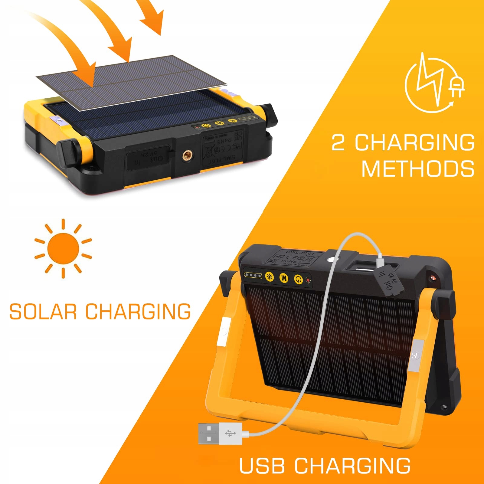 [Ładowanie USB i awaryjne ładowanie solarne]Akumulatorowa lampa robocza może używać dołączonego kabla USB 5V / 2A do ładowania akumulatorowej lampy roboczej lub korzystać z energii słonecznej. Ponieważ ładowanie solarne trwa bardzo długo, zaleca się korzystanie z ładowania USB w normalnych czasach, a ładowanie solarne może być używane w przypadku awarii zasilania lub nagłych wypadków.