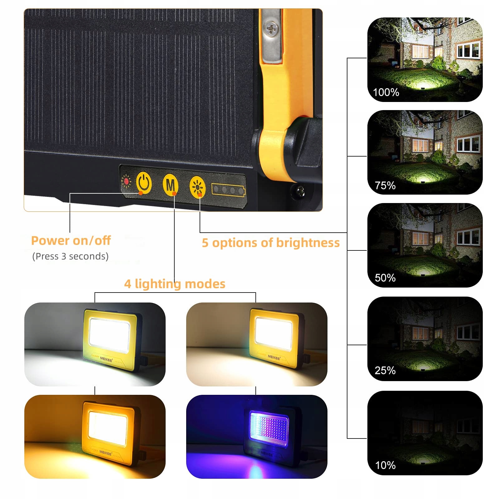 [4 tryby oświetlenia, 5-stopniowe przyciemnianie]MEIKEE akumulatorowa lampa robocza LED oferuje zimne białe światło/naturalny kolor/ciepłe białe światło/tryb oświetlenia SOS. Możesz wybrać zimne białe światło, aby poprawić widoczność wokół siebie. Jeśli chcesz stworzyć atmosferę, możesz wybrać ciepłe białe światło. Tryb oświetlenia SOS może być używany w nagłych wypadkach jako sygnalizator SOS. W pierwszych 3 trybach dostępne są 5 stopni przyciemniania (100%-75%-50%-25%-10%).