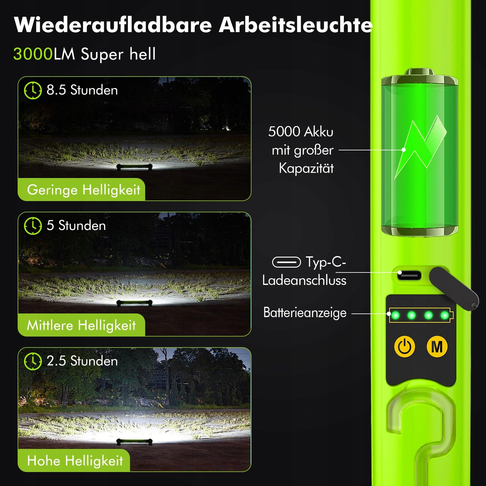 [Szybkie ładowanie i wskaźnik akumulatora]Ładowalna lampa robocza posiada złącze typu C i może być szybko w pełni naładowana w zaledwie 2,5 godziny; 4-stopniowy wskaźnik akumulatora ułatwia sprawdzenie pozostałej mocy i przypomina o terminowym ładowaniu. Wyposażony w ładowalny akumulator o dużej pojemności 5000 mAh zapewnia długoterminowe oświetlenie.