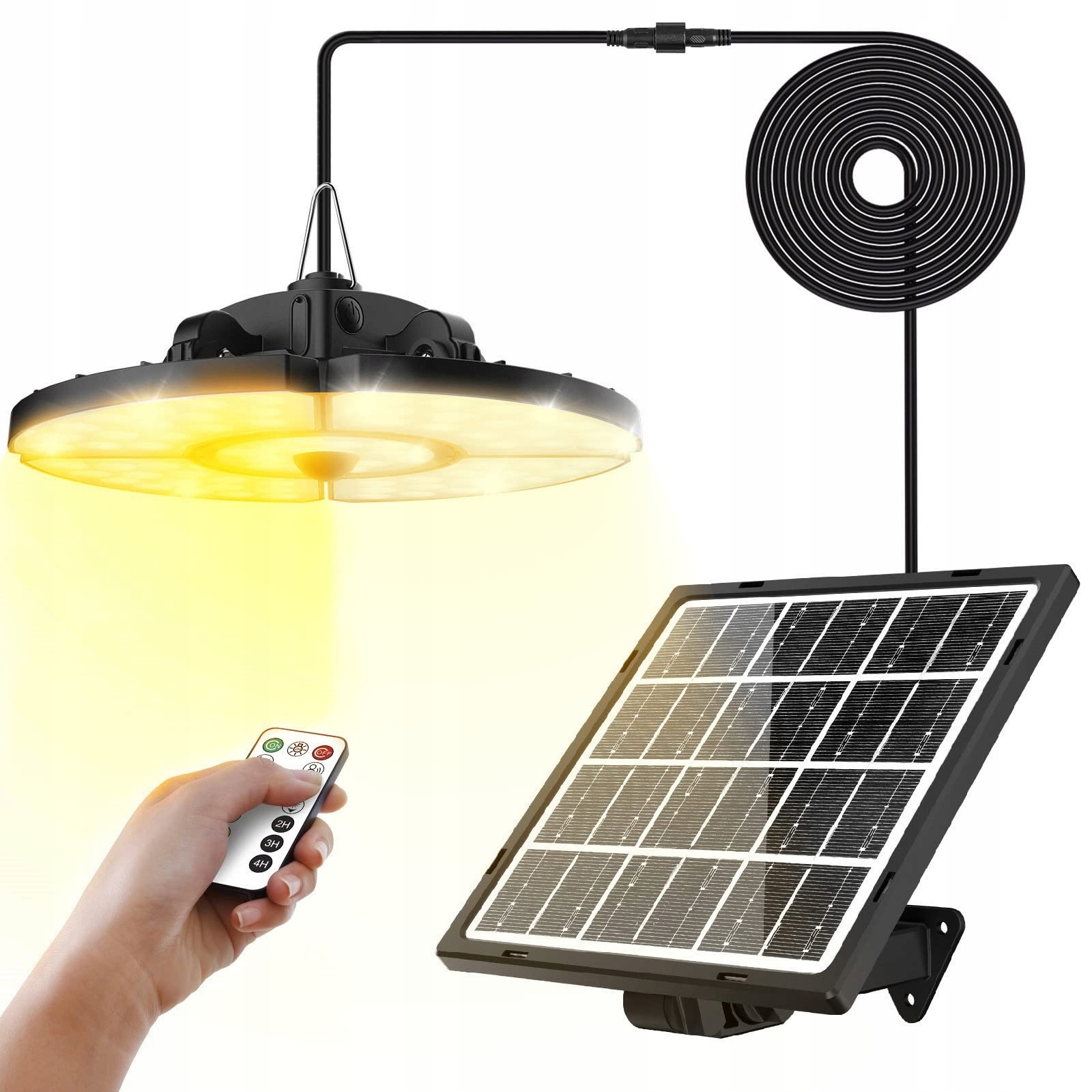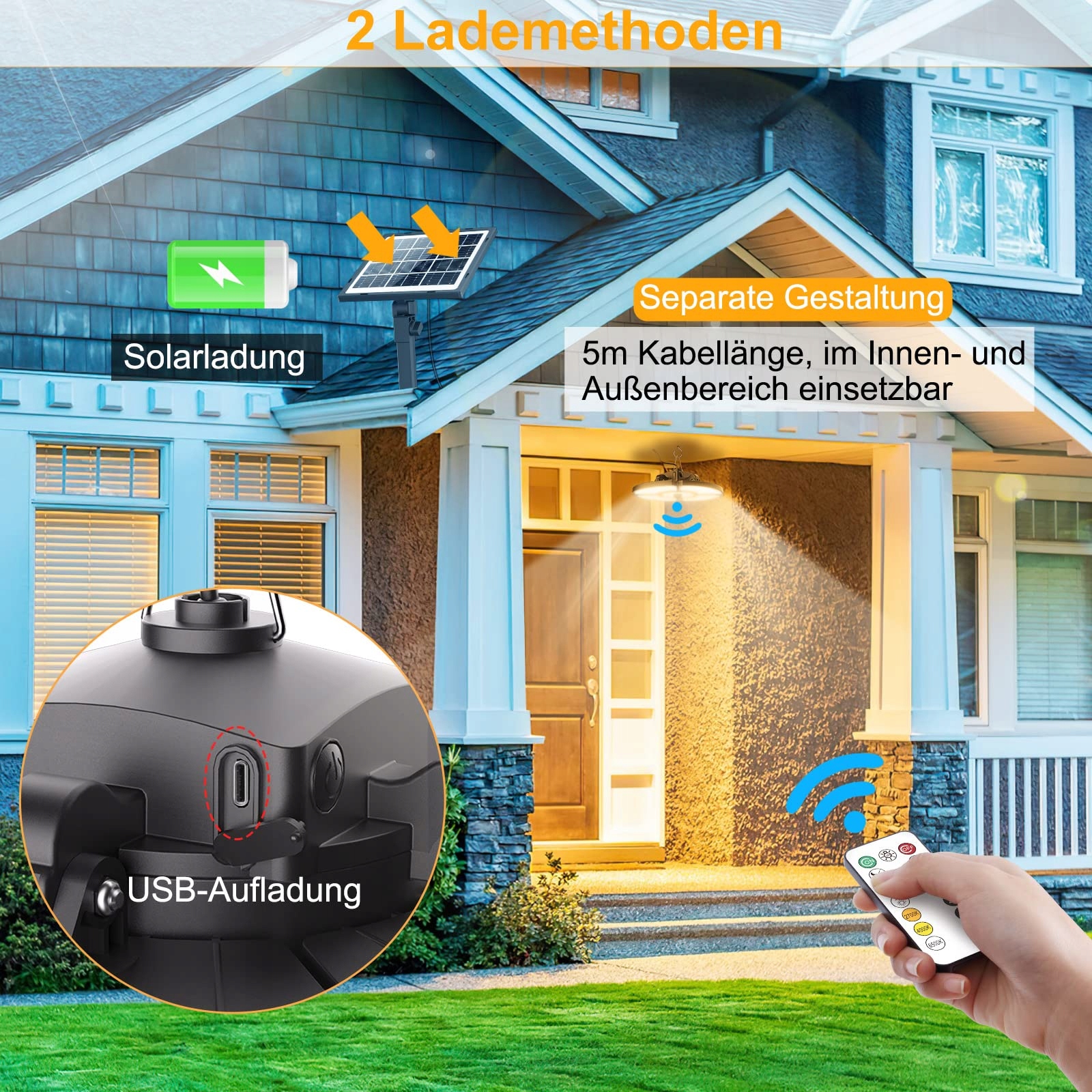 【Łatwa instalacja i szerokie zastosowanie】Panel solarny z czujnikiem ruchu wyposażony jest w 5-metrowy kabel do podłączenia panelu słonecznego. Panel solarny można umieścić na zewnątrz, a lampy wiszące solarne zawiesić w miejscu osłoniętym. Idealne do szop, altan, werand, garaży, stodół, kurników, magazynów, wiat garażowych, piwnic, podwórek, ogrodów i innych.