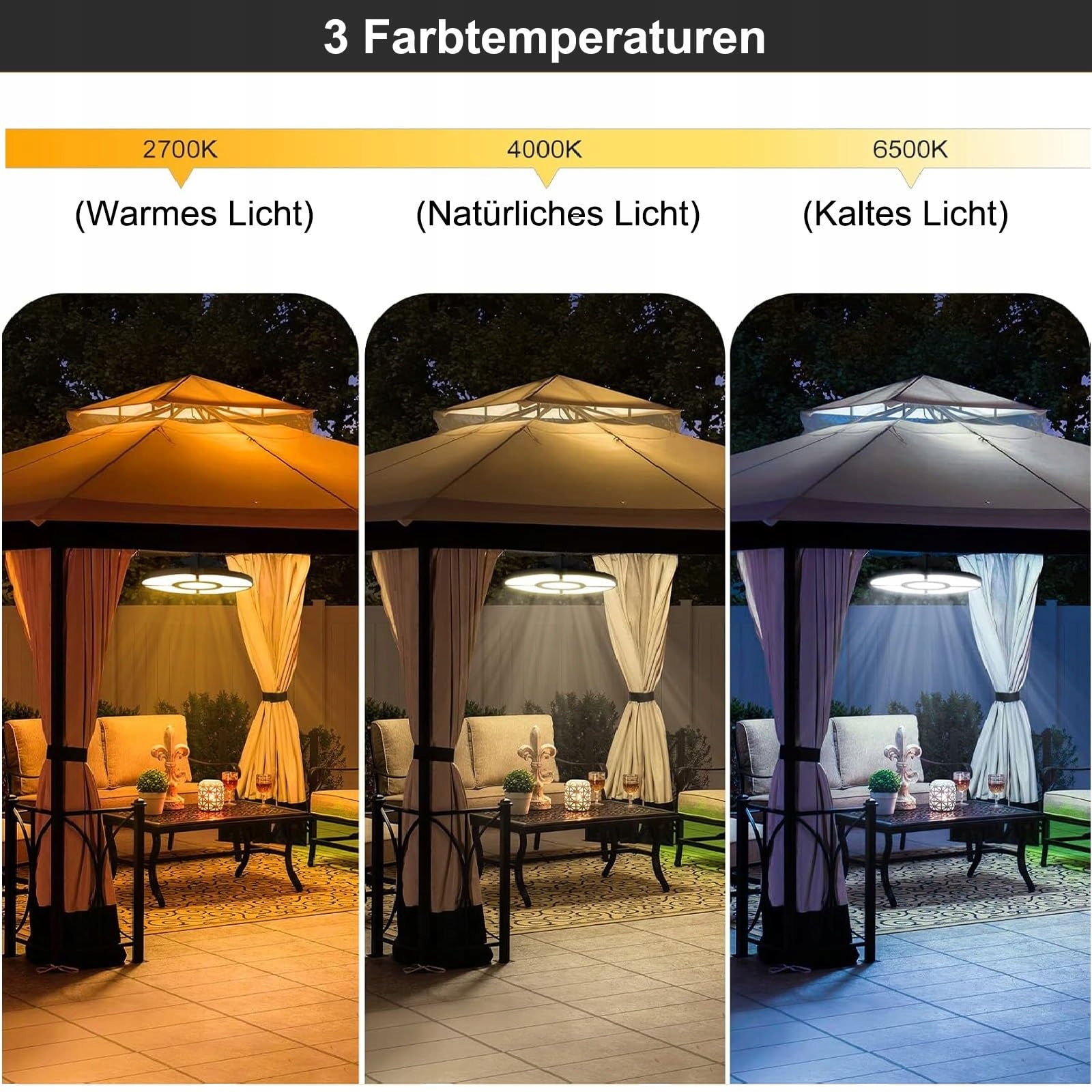 【3 temperatury barwowe, regulowane oświetlenie o szerokim kącie】MEIKEE lampa wisząca solarna posiada 3 bezstopniowe temperatury barwowe: ciepła biel/naturalna biel/zimna biel, dzięki czemu możesz wybrać ulubione światło w zależności od różnych scen. Reflektor solarny zewnętrzny jest wyposażony w wysokiej jakości 76 diod LED i 4 regulowane listwy świetlne, które zapewniają szerokokątne oświetlenie 270 stopni o wysokiej jasności.