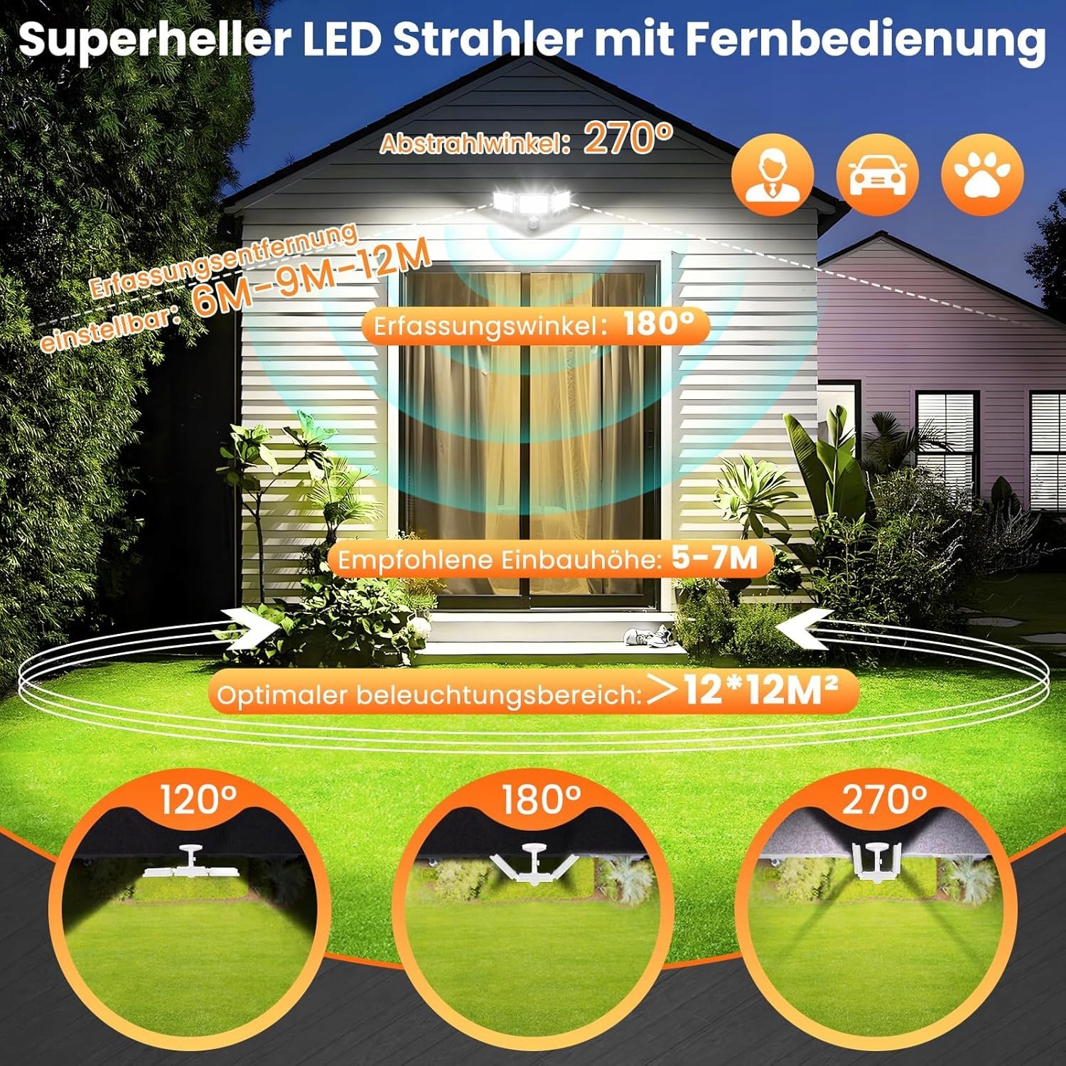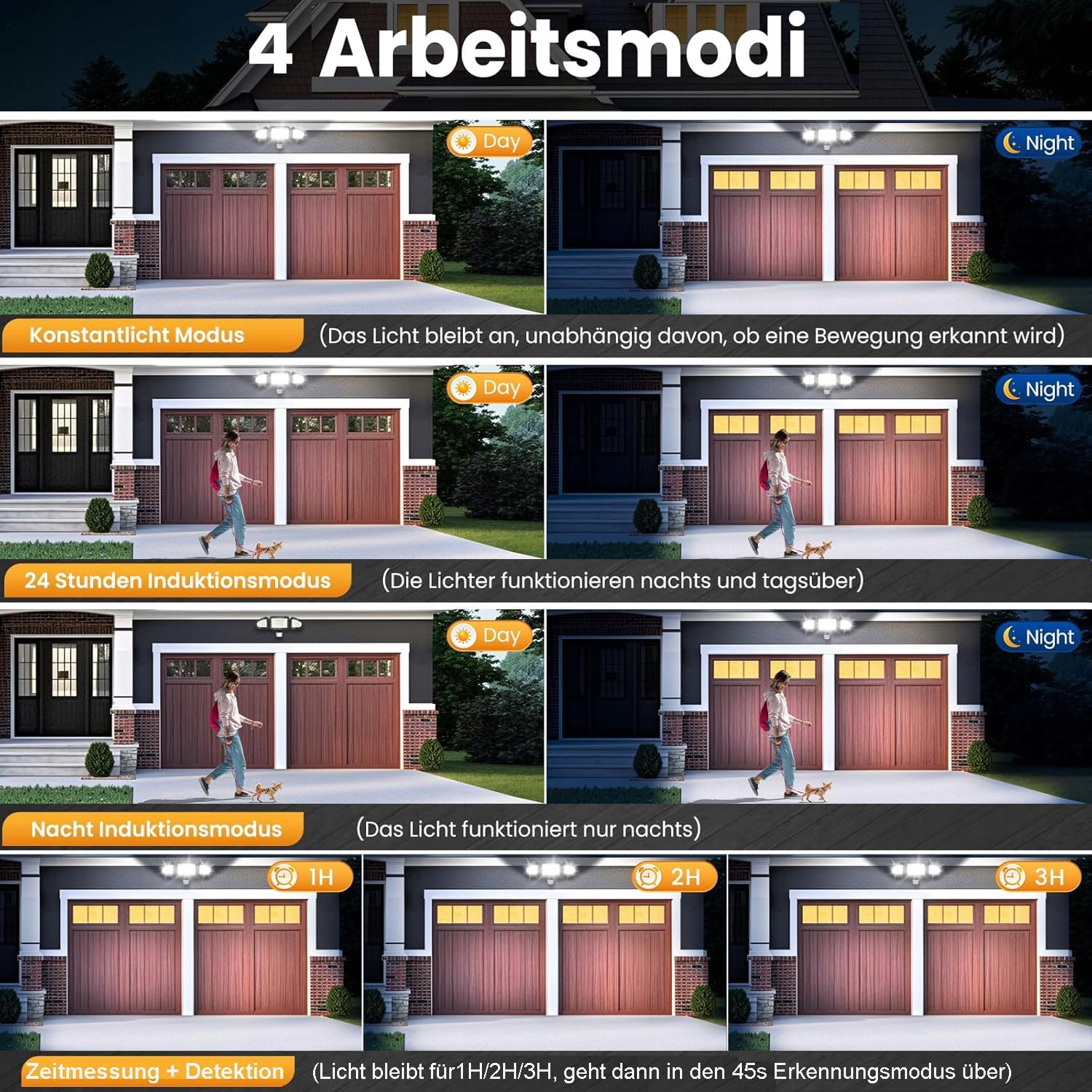 (4 tryby z pilotem): MEIKEE LED zewnętrzne lampy bezpieczeństwa z czujnikiem ruchu 100W osiągają 9600LM ultra jasności, regulowany zasięg wykrywania: 6m, 9m, 12m, czas świecenia (45s-90s-120s-5min-10min), tryb świecenia (tryb wykrywania 24 godziny, tryb wykrywania tylko w nocy, tryb stałego włączenia, tryb czasowy + wykrywania). Wyposażony w pilota do łatwej obsługi, bez konieczności wspinania się, aby ustawić czujnik ruchu