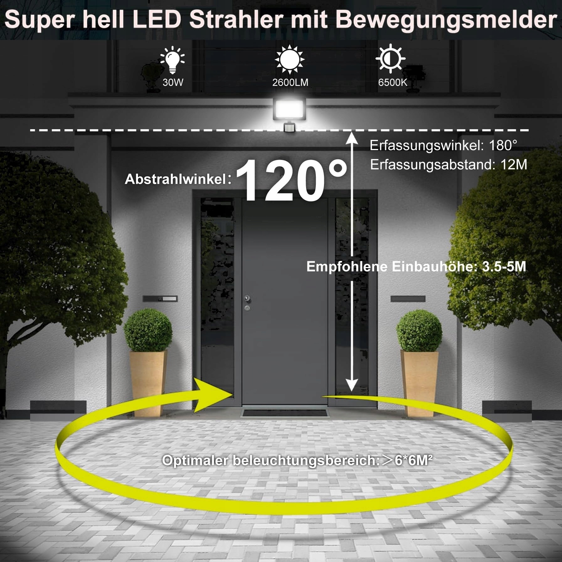 Super jasne i energooszczędne: MEIKEE 30W zewnętrzny reflektor z czujnikiem ruchu wykorzystuje zaawansowaną technologię SMD, która może generować 2800 lumenów, co jest o ponad 85% bardziej efektywne energetycznie niż żarówki 250W. Duże, gładkie powierzchnie odbijające redukują niechciane odbicia i załamania światła. Przy tej samej mocy, jasność reflektorów LED Meike może być zwiększona o 30%. Ponadto, kąt świecenia 120 stopni może zapewnić szerokie spektrum oświetlenia