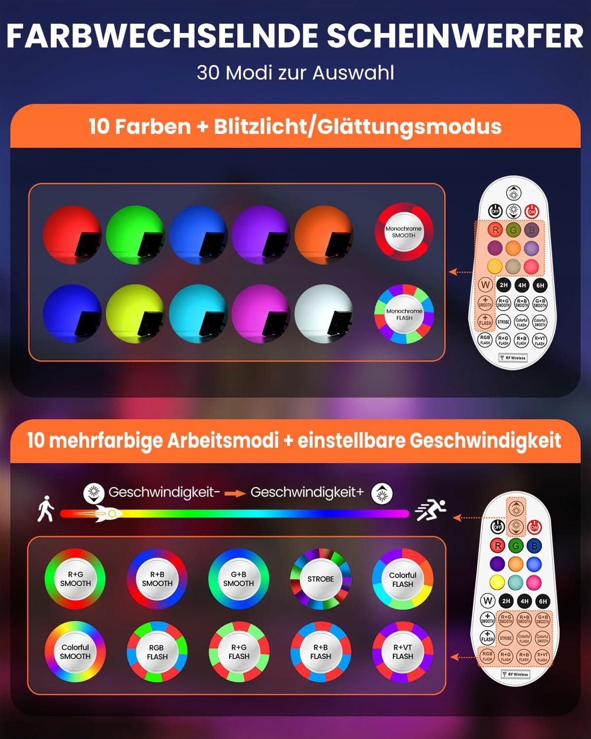 【Z pilotem 360 stopni, zasięg pilota 12m】Reflektor RGB z pilotem i wtyczką może być sterowany za pomocą dołączonego pilota (zasięg sterowania wynosi 12 m). Nowo ulepszony pilot pozwala na zdalne sterowanie światłem o 360 stopni, co oznacza, że nie musisz celować bezpośrednio w przód światła podczas korzystania z reflektora RGB, co jest dla Ciebie wygodniejsze